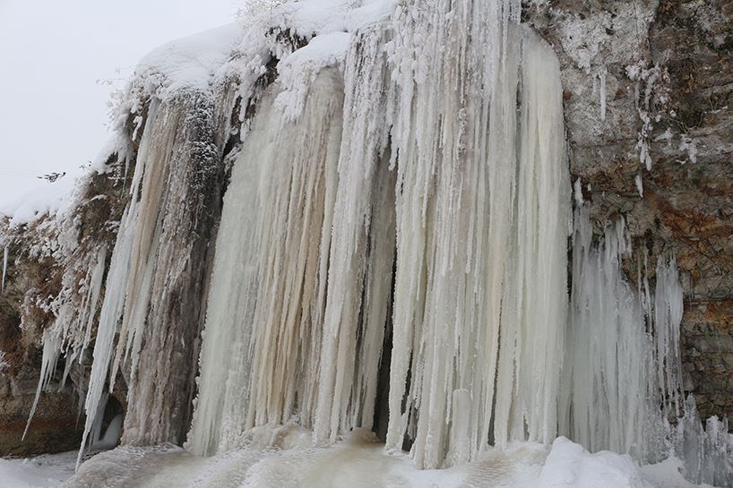 Köy girişinde kayalık bölgede oluşan yaklaşık 5 metre uzunluğunda ve 3 metre genişliğindeki buz sarkıtları dikkati çekti.