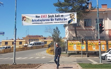AK Parti’nin Diyarbakır’daki “Evet” kampanyası için astığı afişler arasında “Her Evet Şeyh Sait ve arkadaşlarına bir Fatiha’dır” yazılı bir pankart da yer aldı.