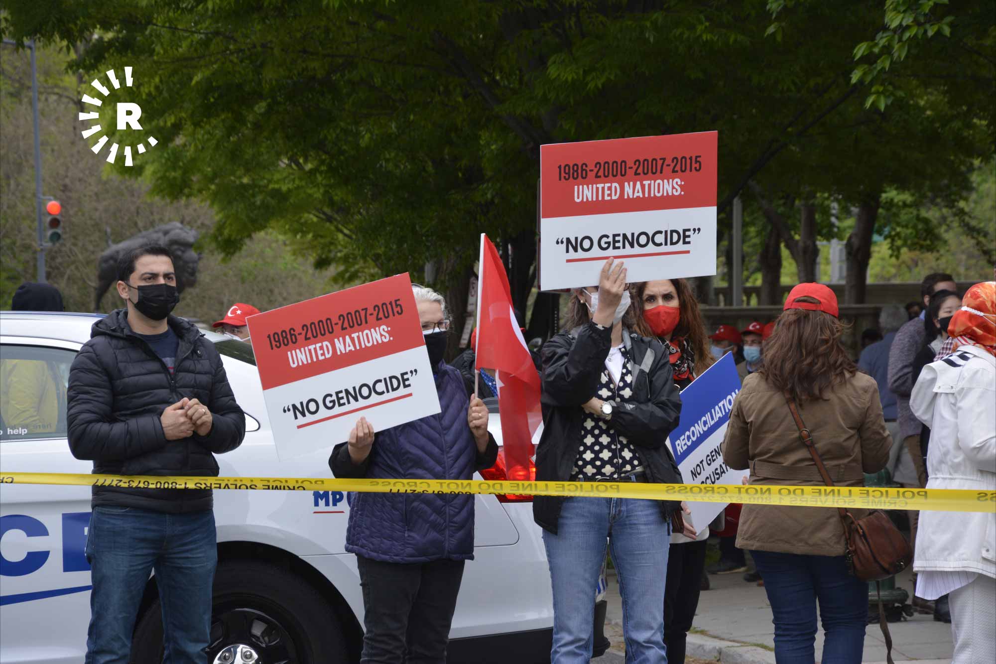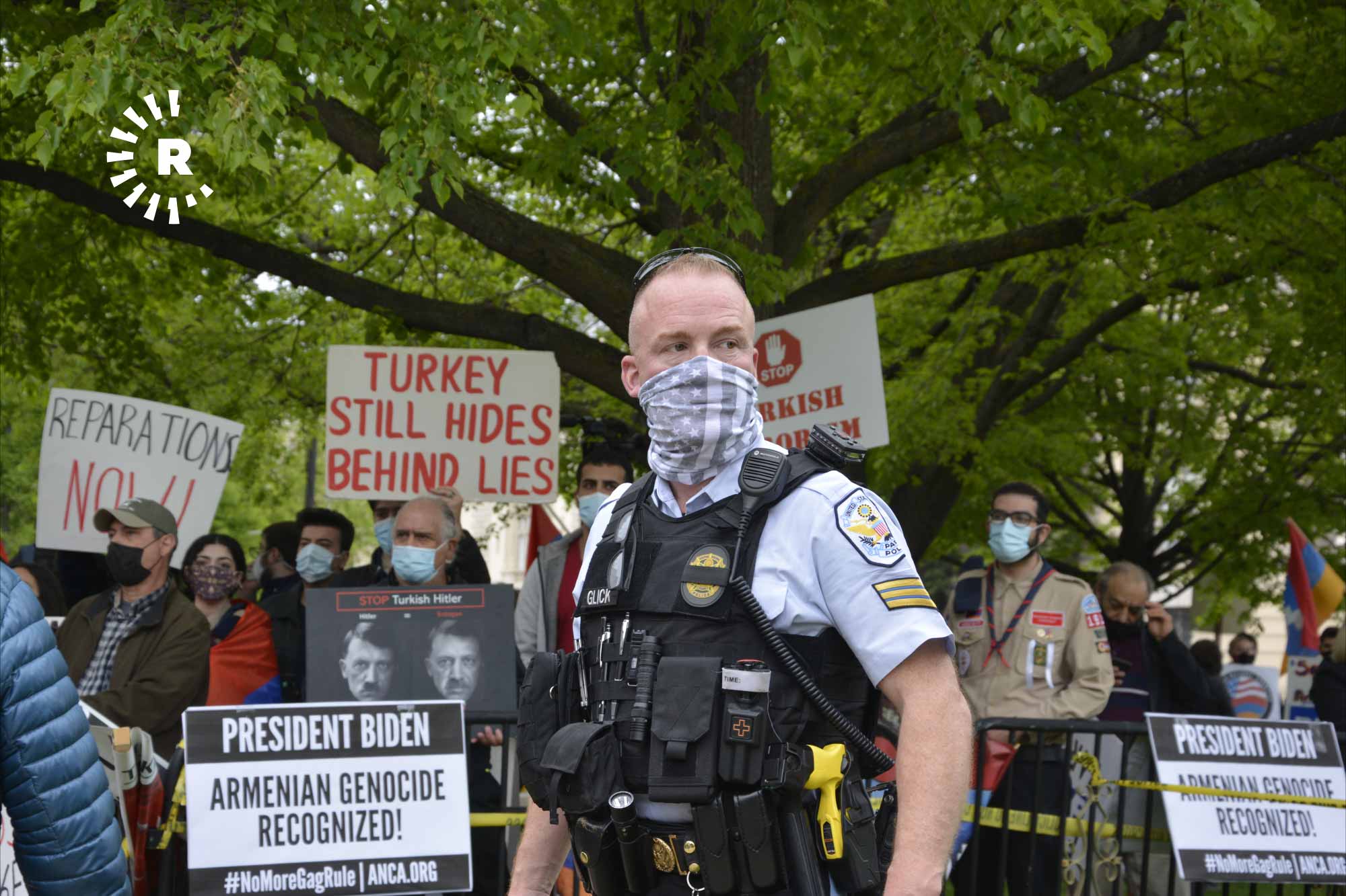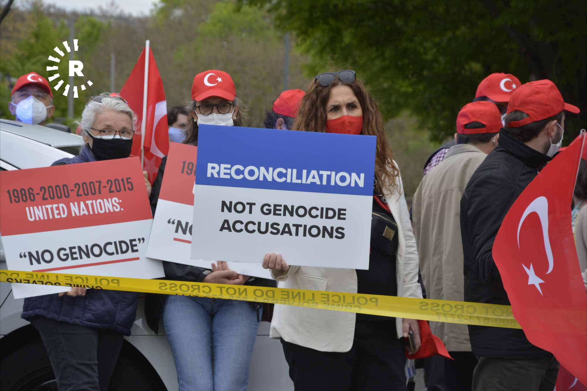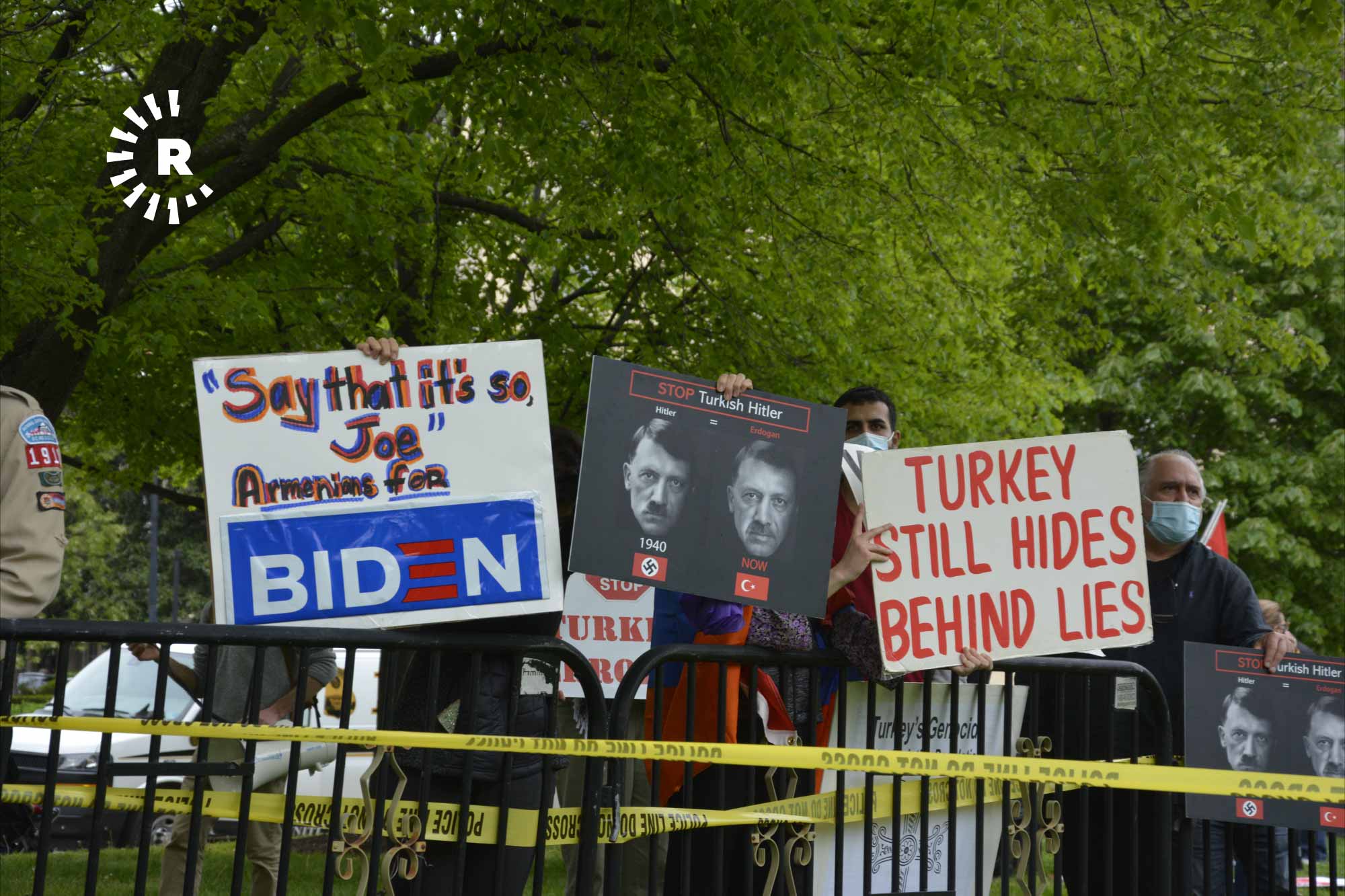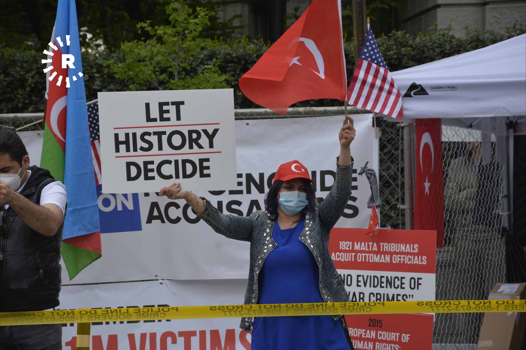 Türkler de Biden’in kararına Türkçe şarkılar ve milli marş çalarak tepki gösterdiler. Türk göstericiler, ‘1915 yılında yaşanan olayların soykırım olmadığını savaş sırasında her iki taraftan ölenler olduğunu’ savunuyor.