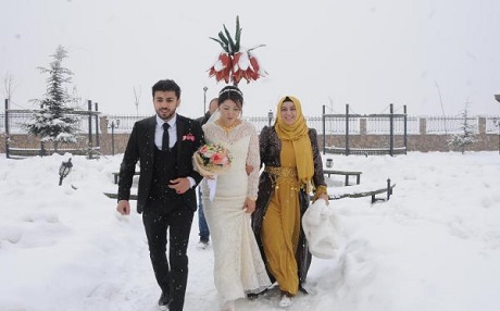 Kar yağışı altında düğünün yapılacağı sahaya gelen ve burada fotoğraf çektiren Kaya ile Ham, davetliler tarafından alkış ve zılgıtlarla karşılandı.