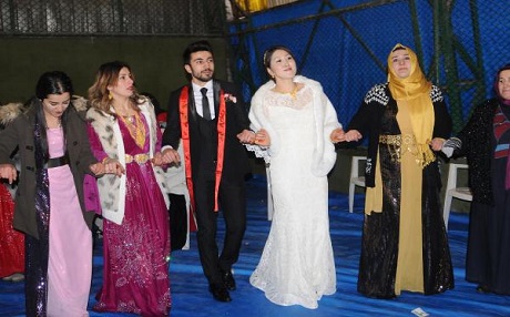 Takı töreni ardından gelin Ham ve damat Kaya, davetlilere kol kola girerek Kürtçe müzikler eşliğinde halay çekti.