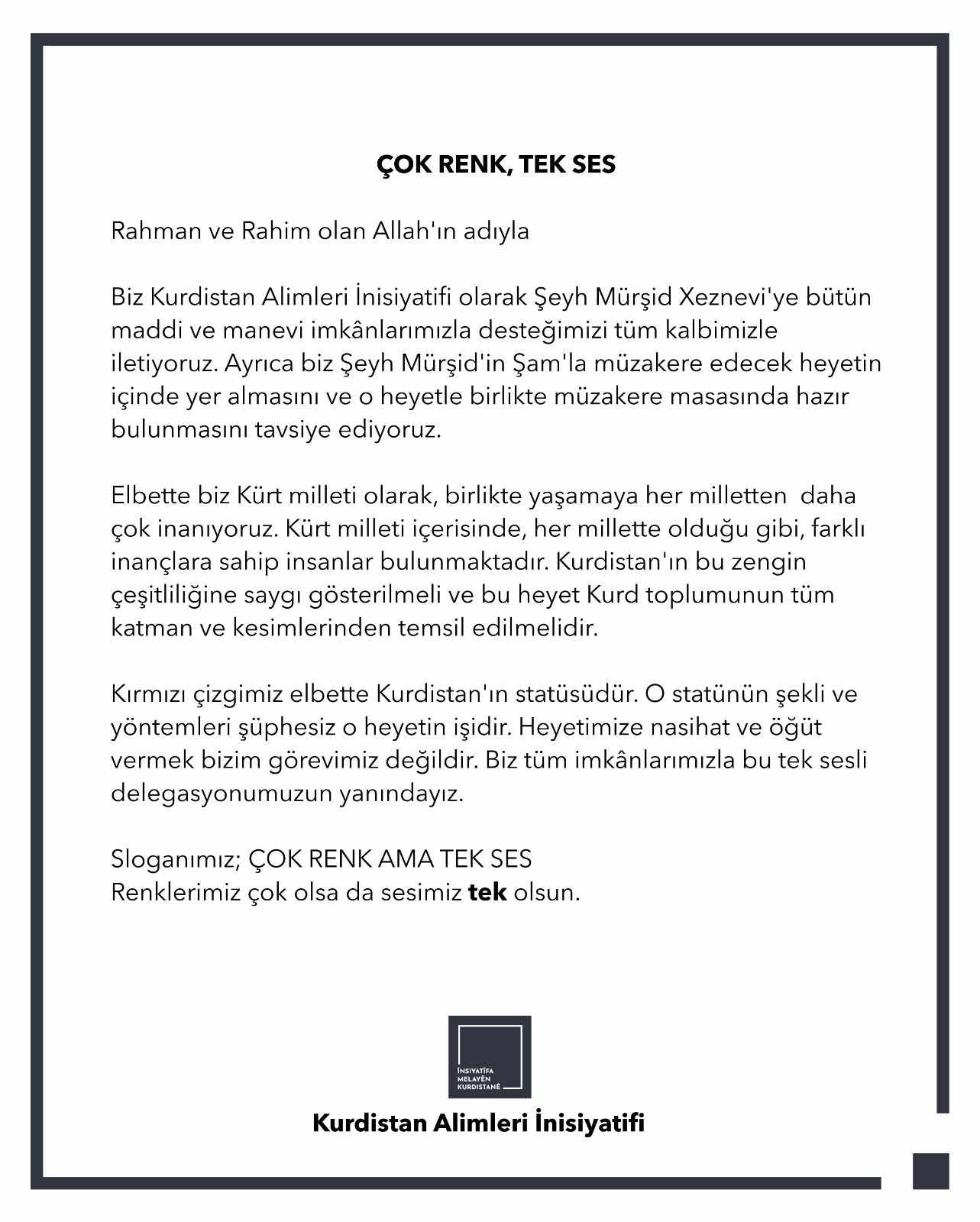 “Biz Kurdistan Alimleri İnisiyatifi olarak Şeyh Murşid Xeznewi'ye bütün maddi ve manevi imkânlarımızla desteğimizi tüm kalbimizle iletiyoruz. Ayrıca biz Şeyh Mürşid'in Şam'la müzakere edecek heyetin içinde yer almasını ve o heyetle birlikte müzakere masasında hazır bulunmasını tavsiye ediyoruz.”