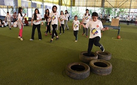 Öğrencilerin sebze kasası, araç lastiği, tahta ve karyola ile oluşturulan parkurdaki yarışmada zıplaması, sürünmesi ve topları potaya atması renkli görüntülere sahne oldu.