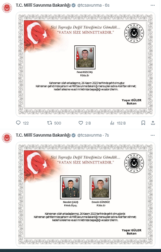 Açıklamada, 26 Kasım 2023 tarihinde yaralanarak hastaneye sevk edilen askerlerden P. Söz. Er Fevzi Kızıltaş'ın da tedavi gördüğü hastanede hayatını kaybettiği belirtildi.