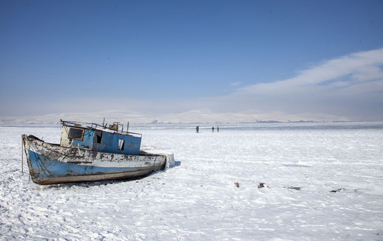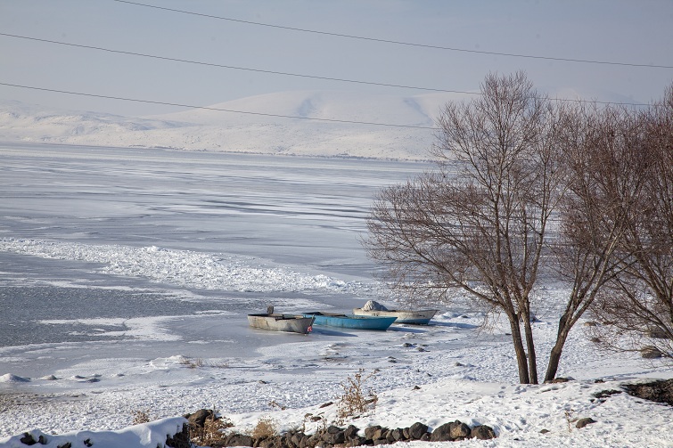 Sıcaklığın sıfırın altında 20 dereceye kadar düştüğü Ahlat'ta Nazik Gölü'nün yüzeyi dondu. Balıkçı tekneleri buzla kaplanan gölde mahsur kaldı. Göle kıyısı bulunan köylerdeki çocuklar buz üstünde kayarak eğlendi.