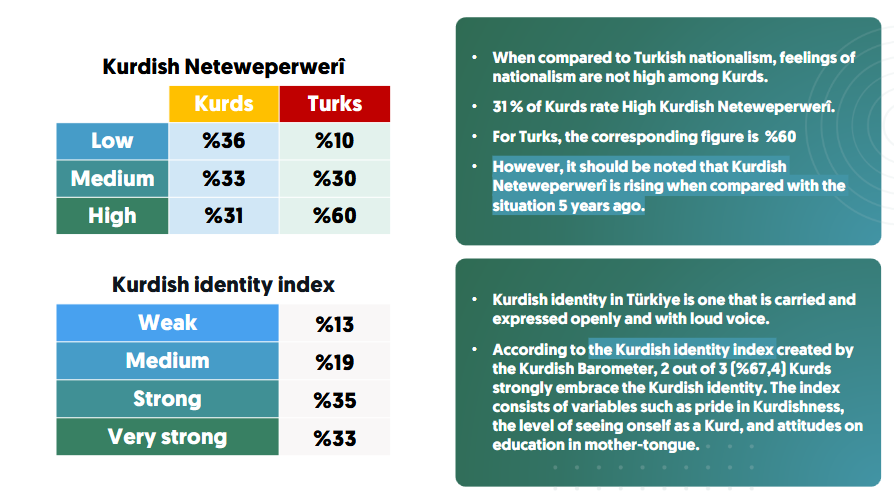 Türkiye'de kendisini yüksek düzeyde neteveperver kabul eden Kürtlerin oranı yüzde 31 ama kendisini yüksek düzeyde Türk milliyetçisi kabul eden Türklerin oranı da yüzde 60.