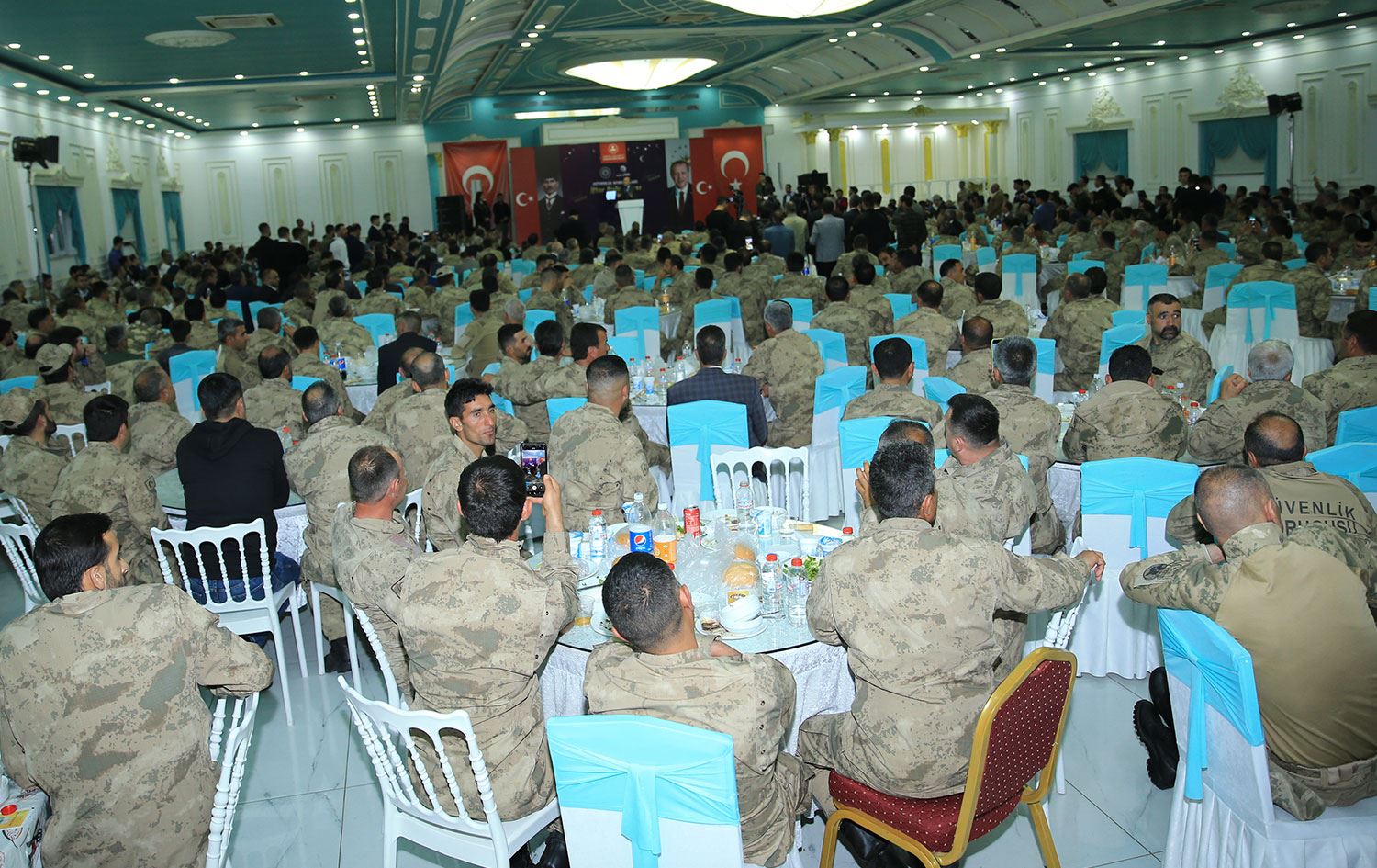 Süleyman Soylu, Bingöl'de bir düğün salonunda güvenlik korucularıyla iftar yemeği yedi. AA.