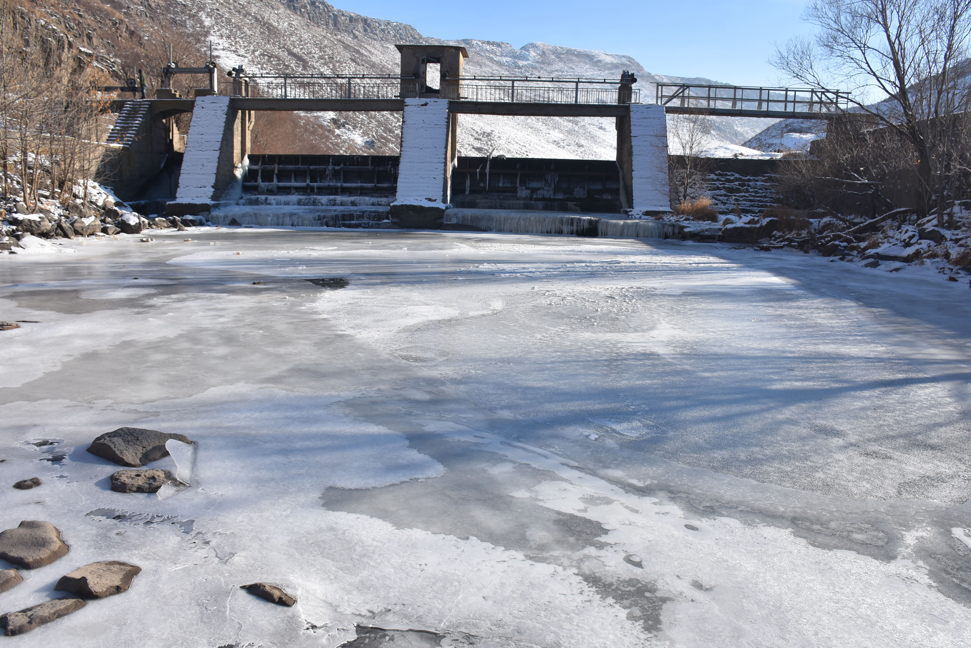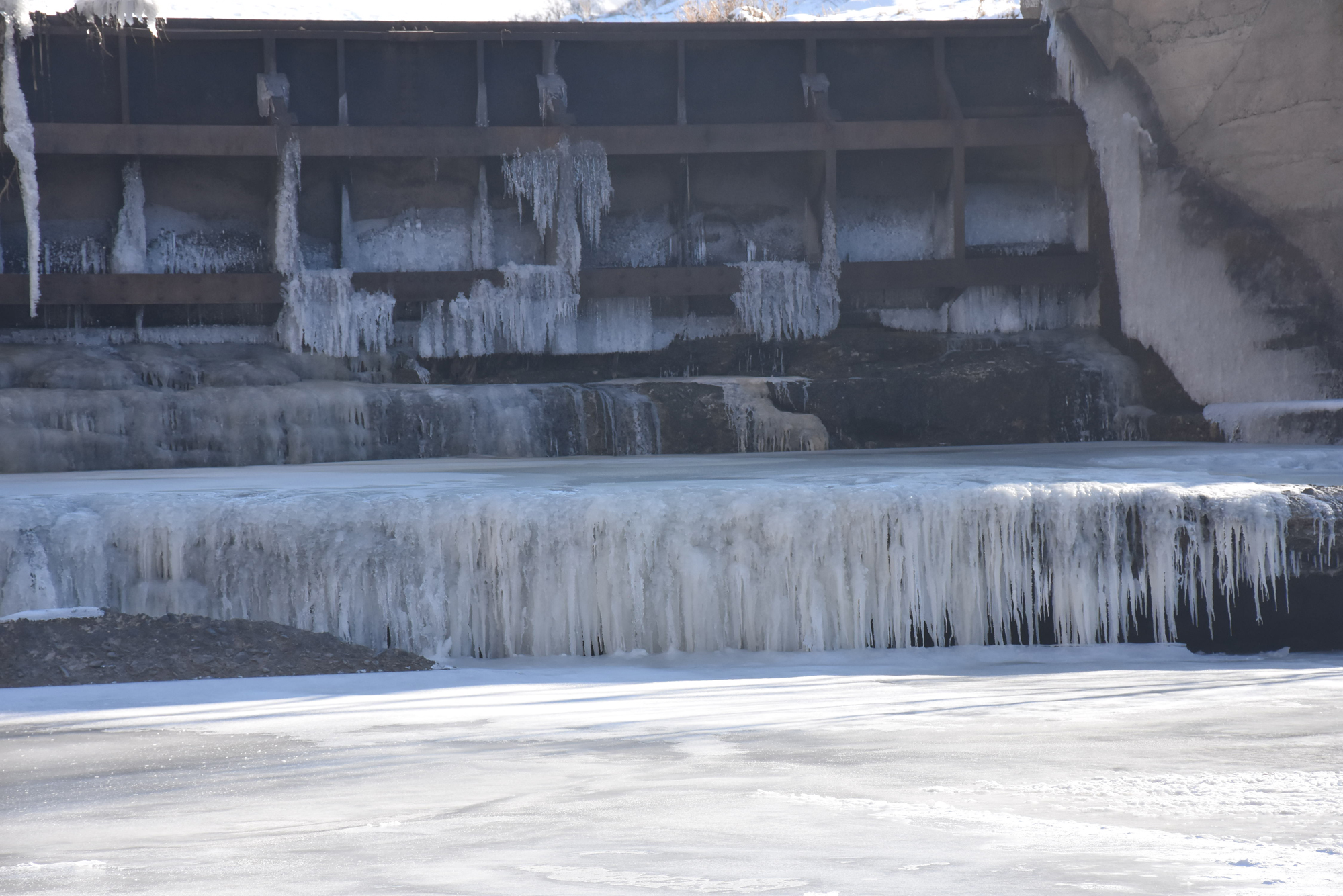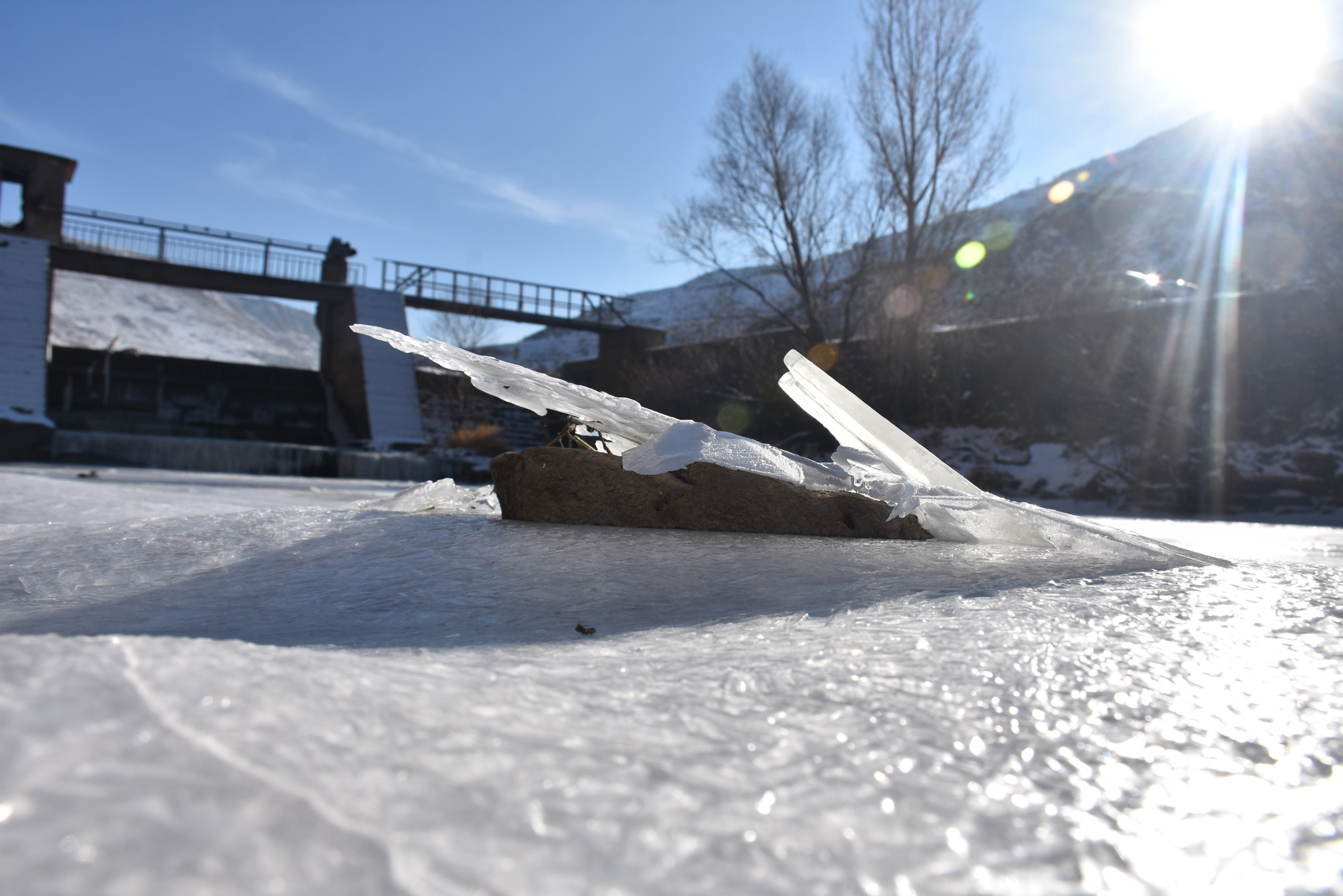 Etkili olan dondurucu soğuklar nedeniyle Kars'taki eski hidroelektrik santrali (HES) baraj gölünün yüzeyi ve Kars Çayı dondu.