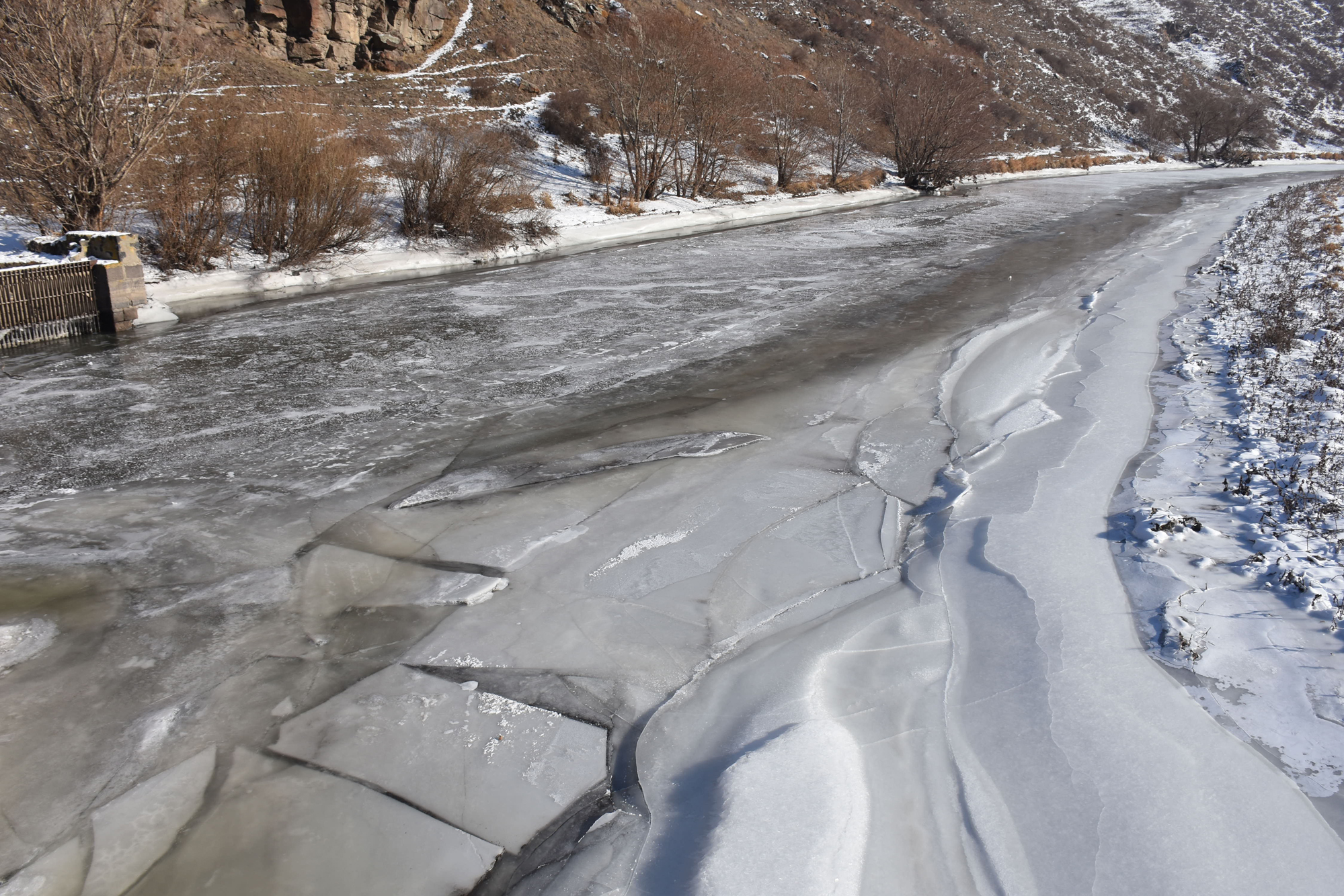 Soğuk hava nedeniyle Kars Kalesi'nin arkasındaki Dereiçi mevkisindeki kullanılmayan HES baraj gölünün yüzeyi ile baraja su sağlayan Kars Çayı buz tuttu.