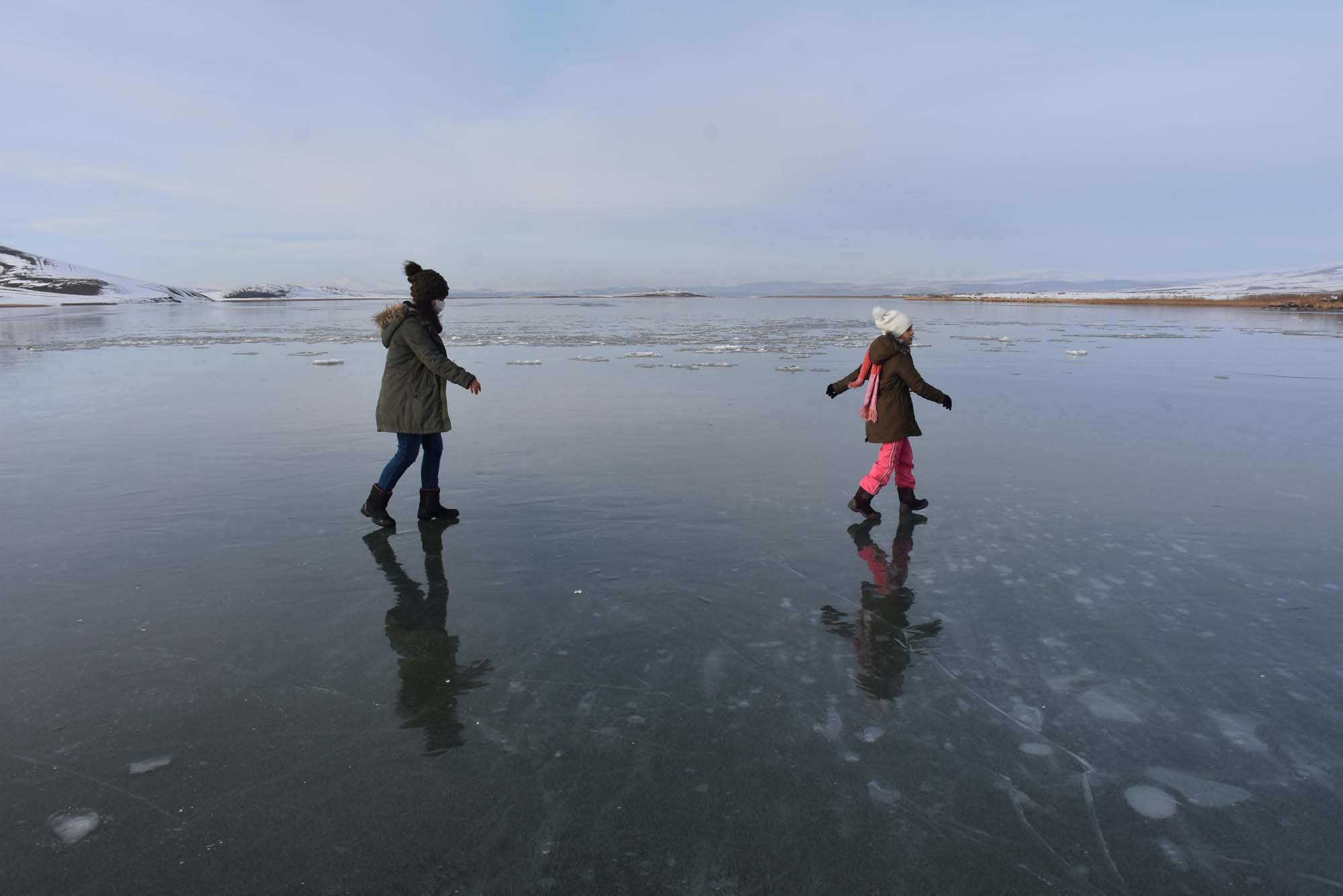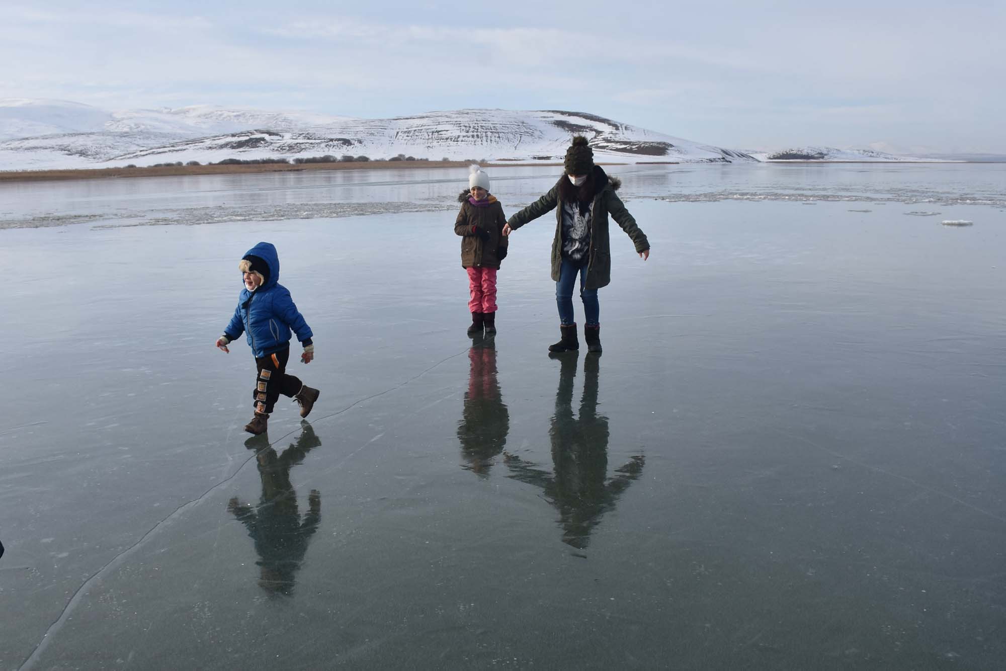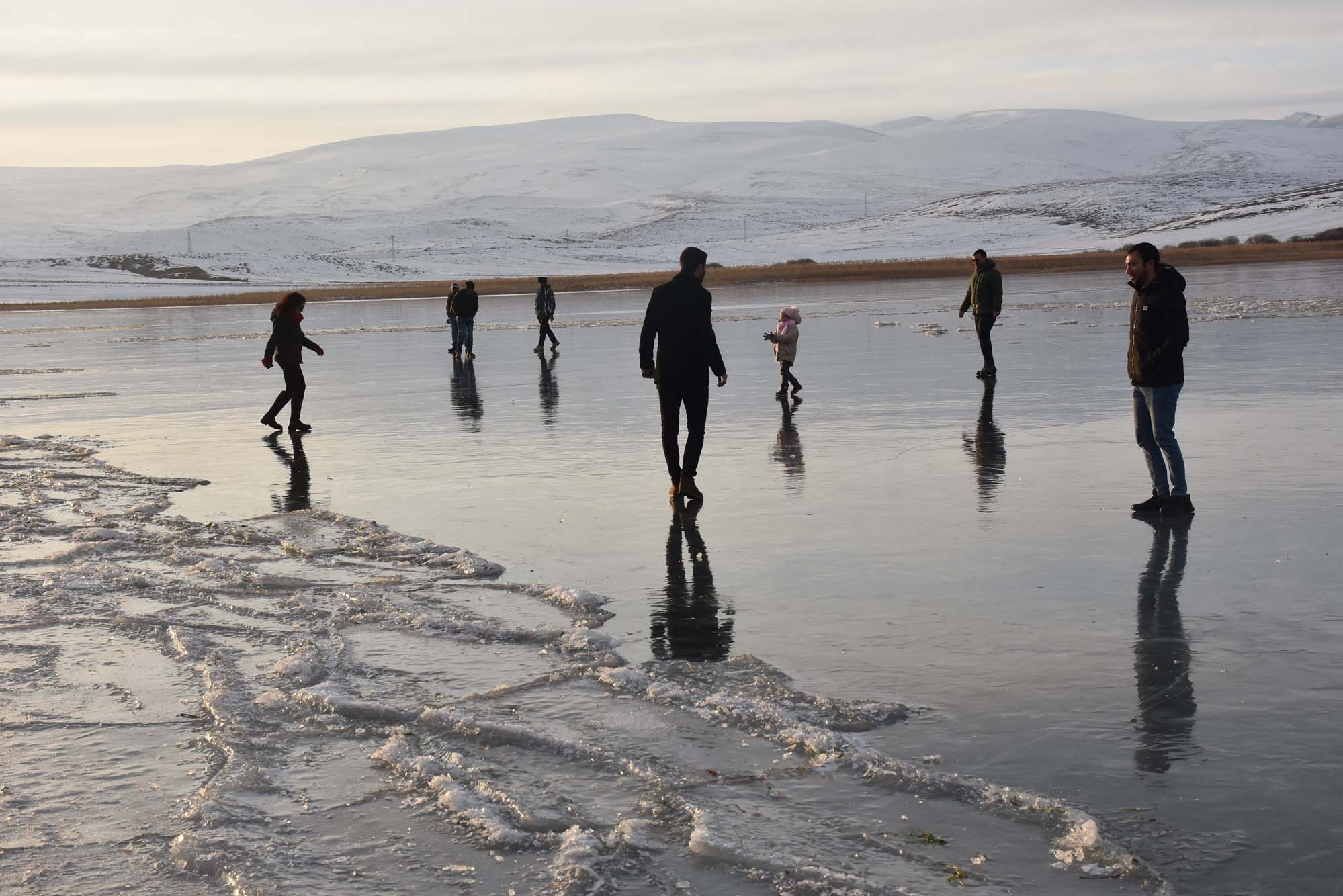 123 kilometrekare alana sahip gölün üzerindeki buz üzerine çıkanlar keyifli anlar yaşadı.