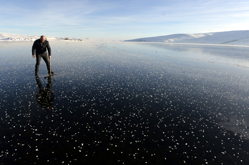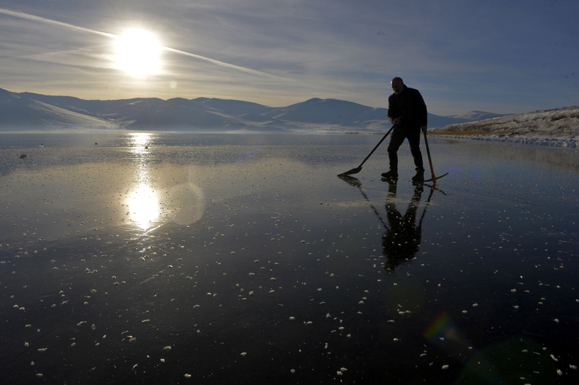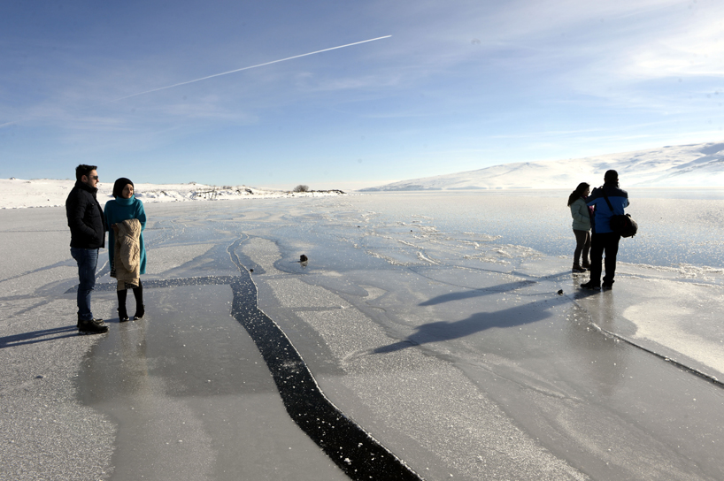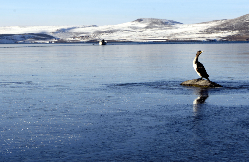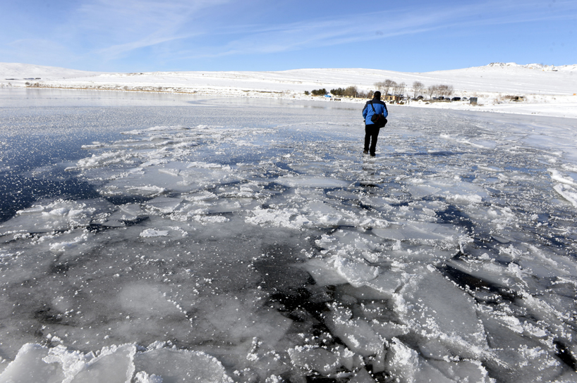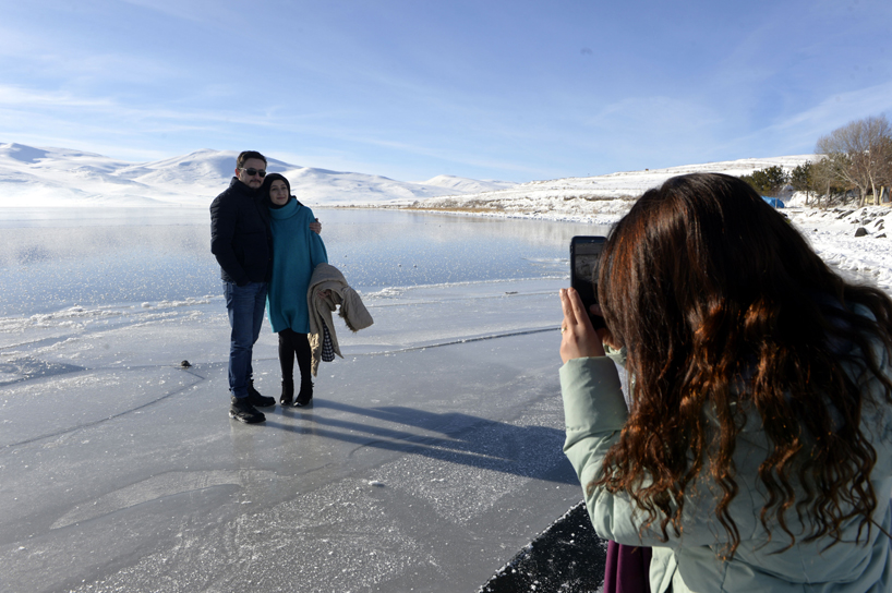 AA - Ardahan’daki Çıldır Gölü, yüzeyindeki buz kalınlığının yeterli seviyeye ulaşmasıyla üstü tamamen dondu.