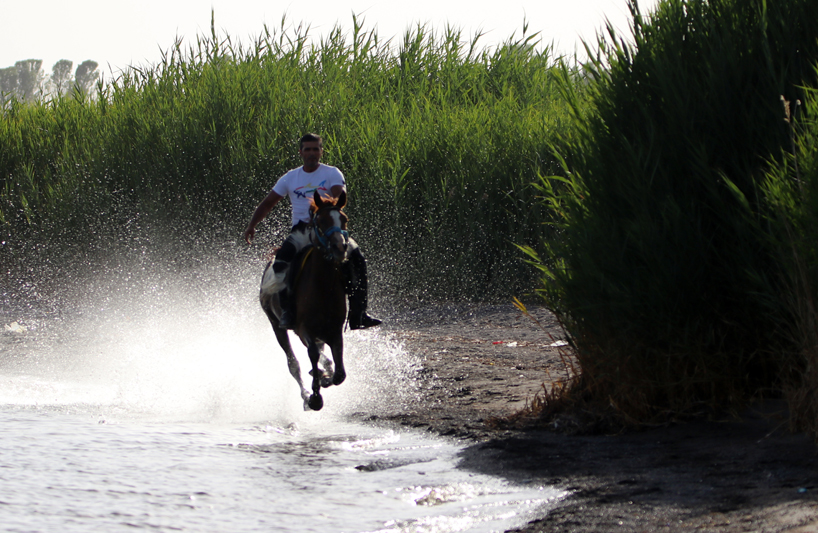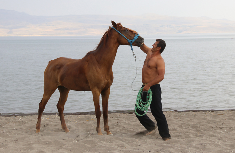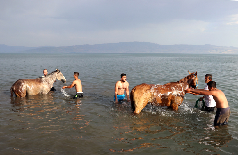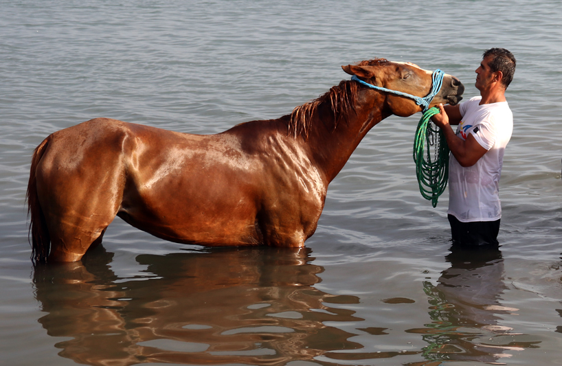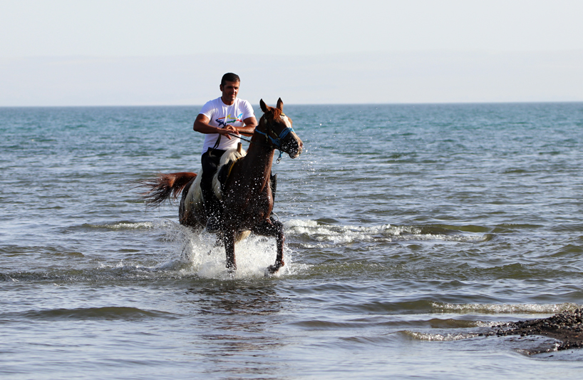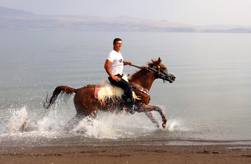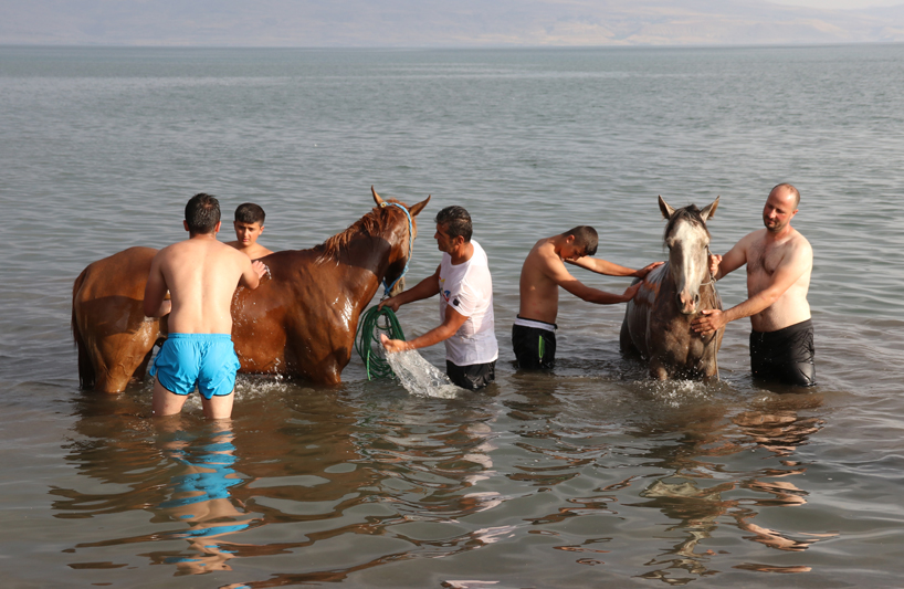 Van’ın Erciş ilçes sahiline getirdiği yarış atlarını önce kumsalda gezdiren İzzet Şevketoğlu, daha sonra atları suyu sodalı olan Van Gölü'nde bir süre yüzdürüyor.