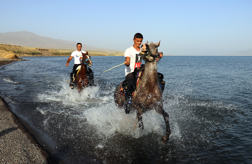 AA - Van Gölü'nde yüzdürülüp, sahillerde antrenman yaptırılan atlar, birçok ilde düzenlenen yarışlarda koşuyor.