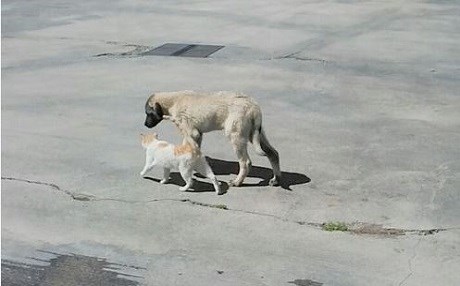 Köpek nereye doğru gidiyorsa kedi de köpeği takip ediyor.