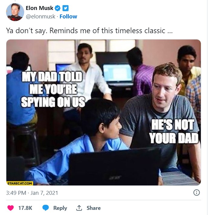 Twitter'ın sahibi Musk, "Eminim dünya başka bir seçeneği olmadan sadece Zuckerberg'in parmağıyla oynatmasını bekleyemez" paylaşımında bulunmuştu.