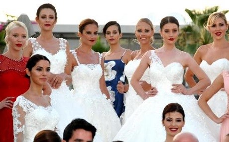 Mankenler podyuma çıktıkları son kıyafetle toplu halde fotoğraf çektirmeleri ardından Günay Musayeva, gelinlikle kumsala yürüyüp denize girdi.