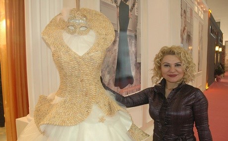 Yaklaşık 5 bin fıstık kabuğunun kullanıldığı gelinlik, fuar ziyaretçileri tarafından büyük ilgi görüyor.