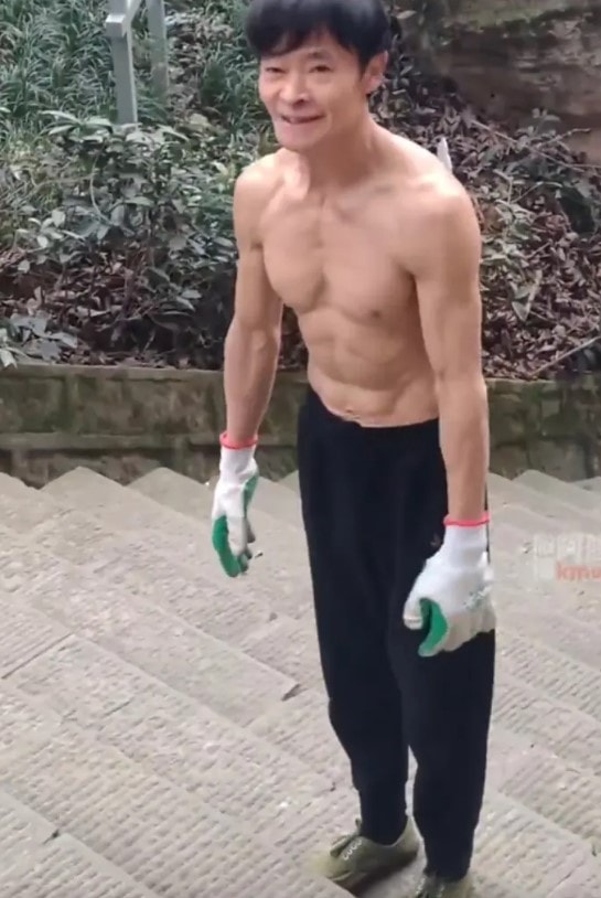 Yaşına rağmen Zou'nun vücudu, dolgun siyah saçları ve iyi tanımlanmış sekiz kaslı karın kaslarıyla çok daha genç bir insanınkine benziyor.