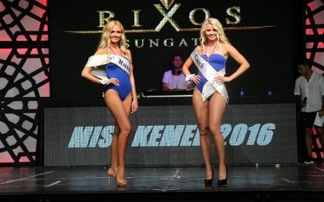 Güzeller jürinin karşısına “Miss Kemer International” yazılı tişörtler ve ardından bikiniyle çıktı.