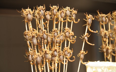 Caddedeki böcek lokantalarında, akrepten, çıyana, yılan türlerine kadar birçok hayvan meraklılarını bekliyor.