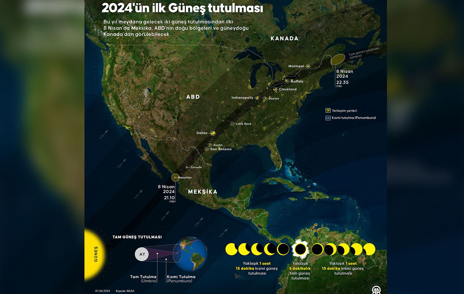 Güneş tutulması 8 Nisan'da Meksika, ABD'nin doğu bölgeleri ve güneydoğu Kanada'dan görülebilecek. / AA