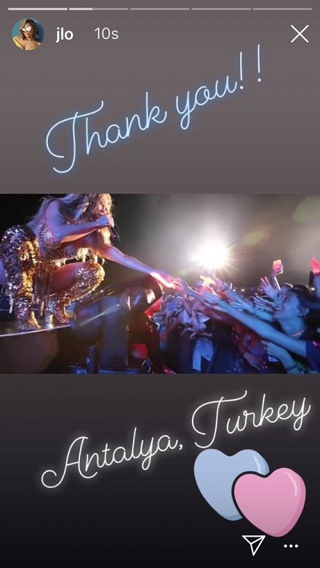 Haber Merkezi – Antalya'da konser veren dünyaca ünlü ABD’li şarkıcı Jennifer Lopez, sosyal medya üzerinden, Türkiye ve Antalya’ya teşekkür ederek “Dün gece Türkiye'de güzel gösteri” ifadelerini kullandı.