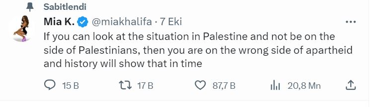 Haber Merkezi - Yetişkin film yıldızı Mia Khalifa'nın, "Lütfen birisi Filistin’deki özgürlük savaşçılarına telefonlarını yan çevirip videoları o şekilde çekmelerini söyleyebilir mi?" sözleri sosyal medyada tepki topladı.