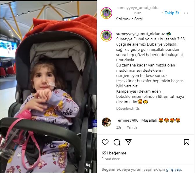 Sümeyye Kurtalış'ın ailesi bugün sosyal medya hesaplarından yaptıkları paylaşımda tedavi olmak üzere Dubai’ye gittiklerini duyurdu.