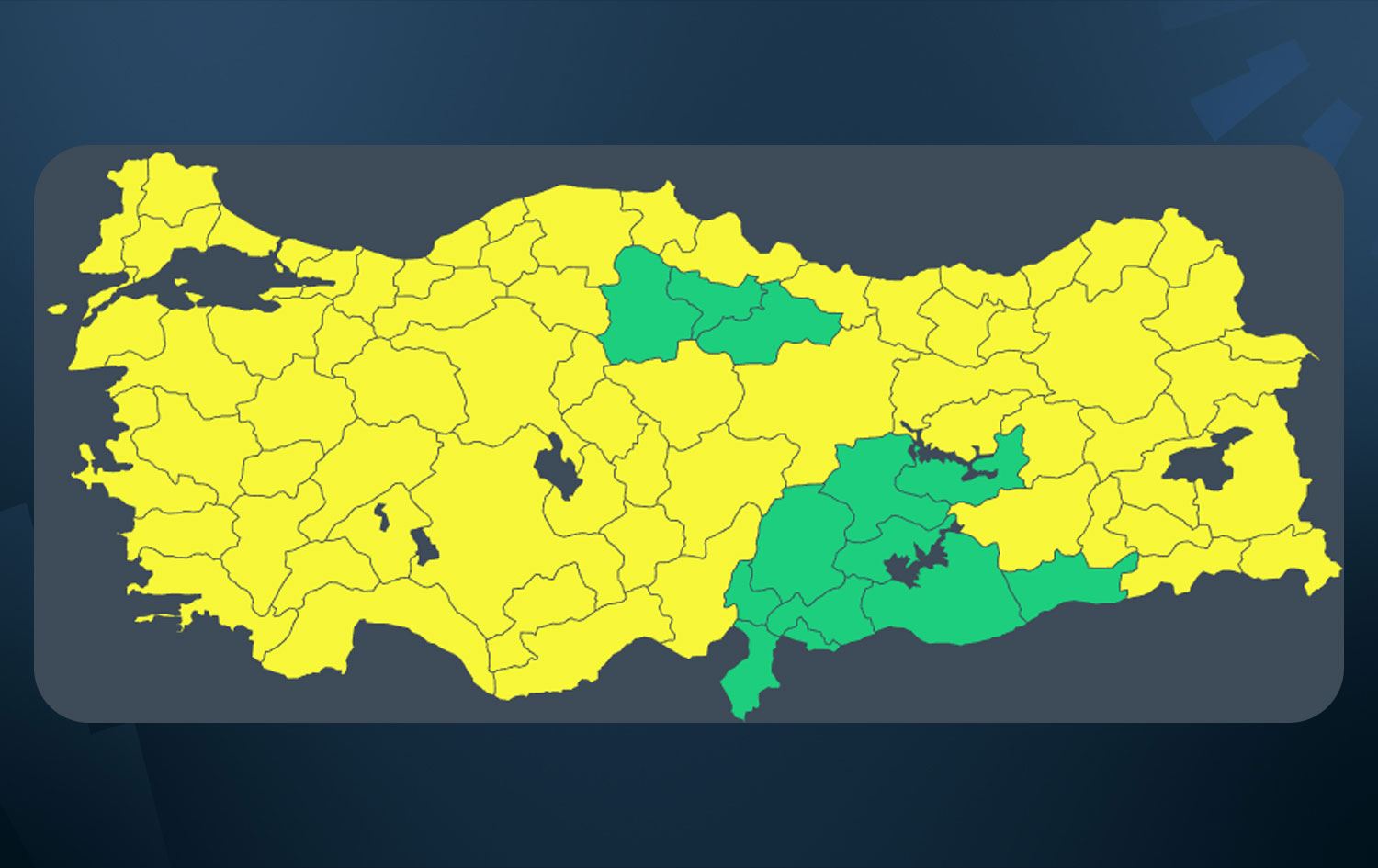MGM, Çorum, Amasya, Tokat, Hatay, Kilis, Osmaniye, Antep, Maraş, Adıyaman, Urfa, Mardin, Malatya ve Elazığ dışındaki tüm kentleri sarı kod yayınlayarak kuvvetli yağış, fırtına ve çığ tehlikesine karşı uyardı.