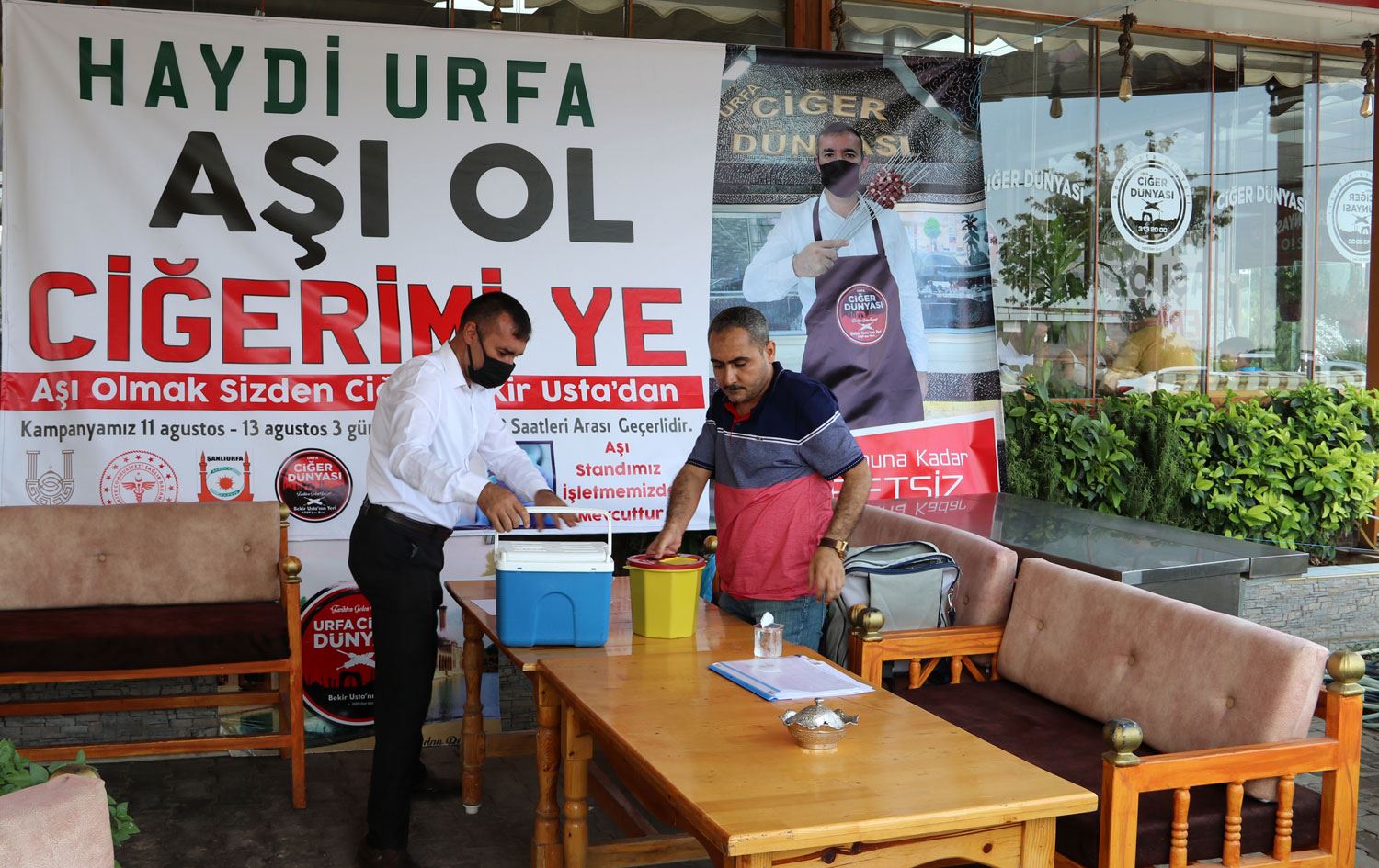 Urfa Gıda ve Toptancılar Sitesi'nde faaliyet gösteren restoranın işletmecisi Bekir Yüksekyayla, aşılama oranında son sıradaki kentte aşıyı teşvik amacıyla ilgili kurumlarla iş birliği yaparak, “Haydi Urfa Aşı Ol Ciğerimi Ye” sloganıyla kampanya başlattı.