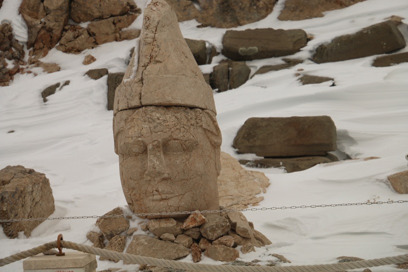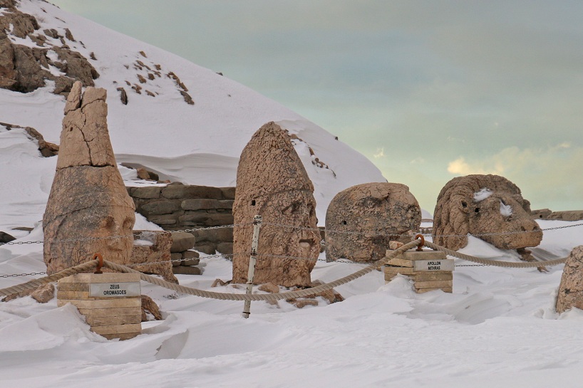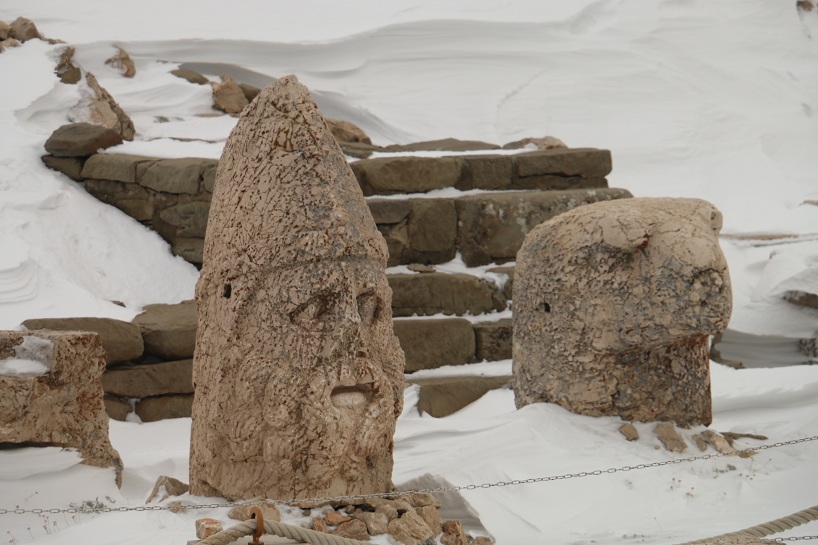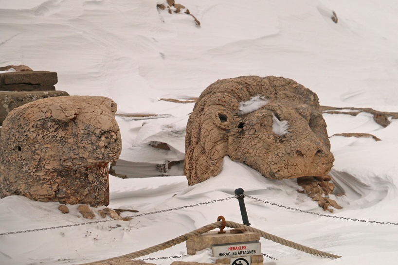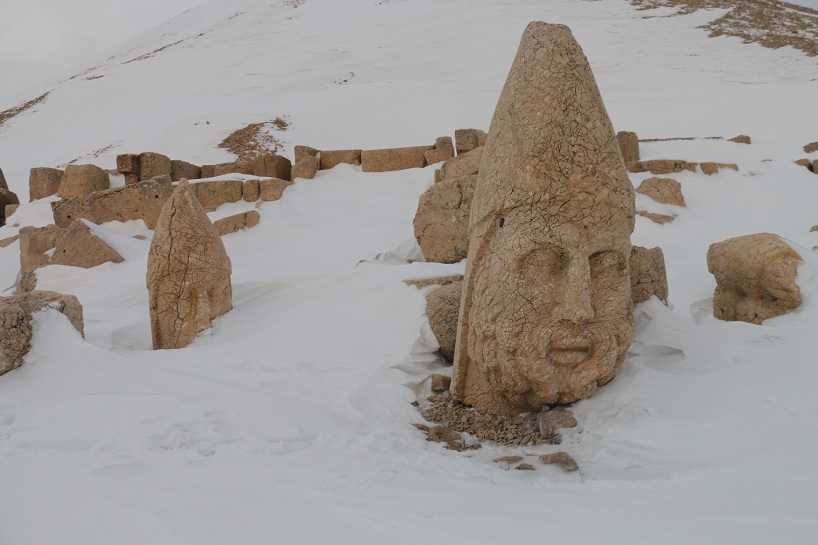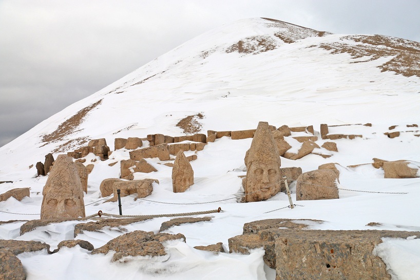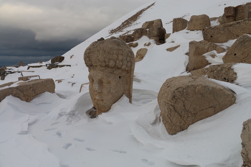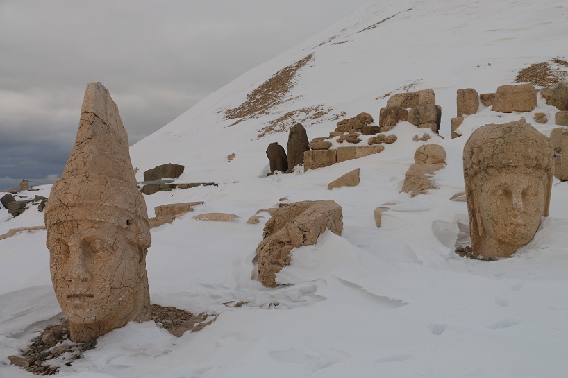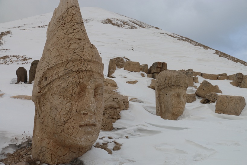 Kar yağışıyla turizm sezonu kapanan Nemrut Dağı'nın doğu ve batı terasında yer alan heykeller karla örtülmeye başladı. Kar örtüsünün bazı yerlerde bir metreden fazla olması binlerce yıllık tanrı heykellerini adeta "kış uykusu"na yatırdı.