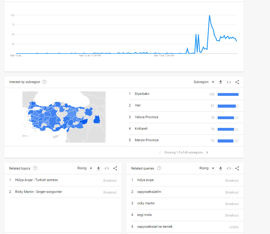 Google Trends sitesine giren çok sayıda kişi “sapyoseksüel nedir?” diye arama yaptı. Siteye göre tarayıcılar en çok Diyarbakır, Van, Yalova, Kırklareli’nden giriş yapıp sordu.