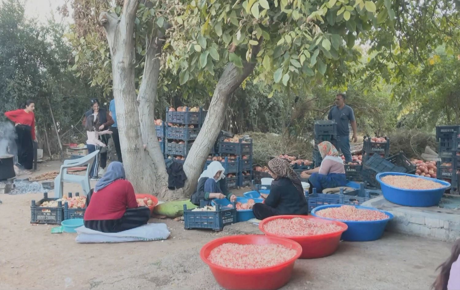 Onlarca kadın bir araya gelerek tonlarca narı ayıklıyor.