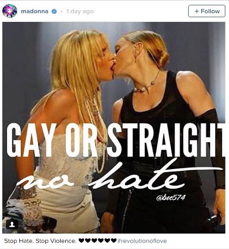 Madonna, 2003 yılında MTV Video Müzik Ödülleri’nde, Britney Spears'ın canlı performansı esnasında öpüştükleri ve geceye damgasını vuran fotoğrafı Instagram hesabından “Nefrete son. Şiddete son” notuyla paylaştı.