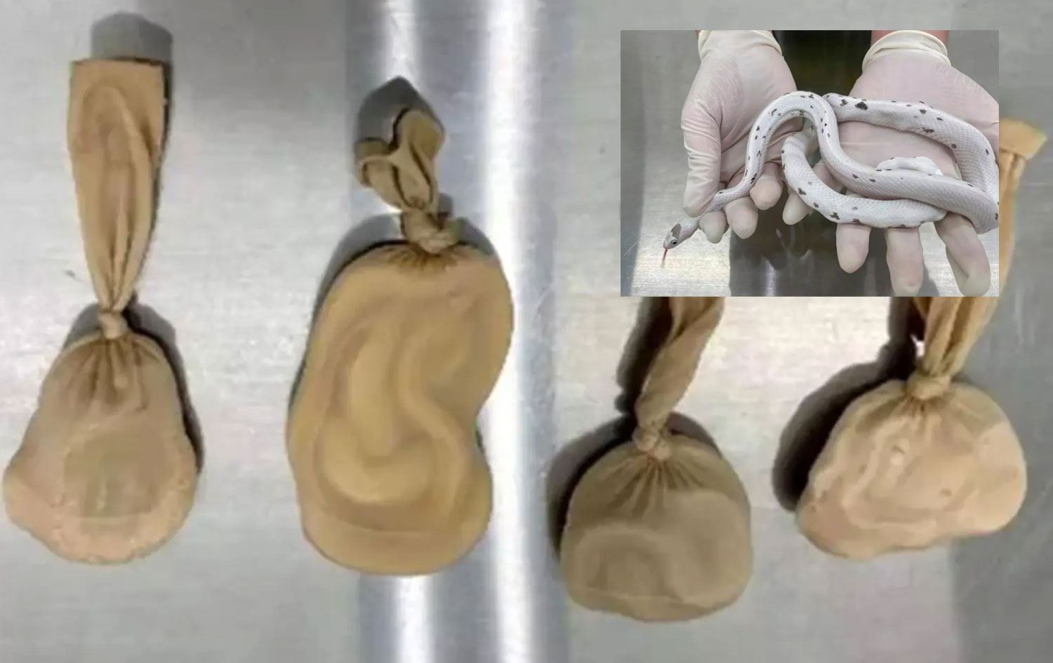 Aramada kadının, külotlu çorapların içine koyduğu 5 adet canlı mısır yılanını sütyeninde saklayarak Hong Kong üzerinden Çin'e geçmeye çalıştığı tespit edildi.
