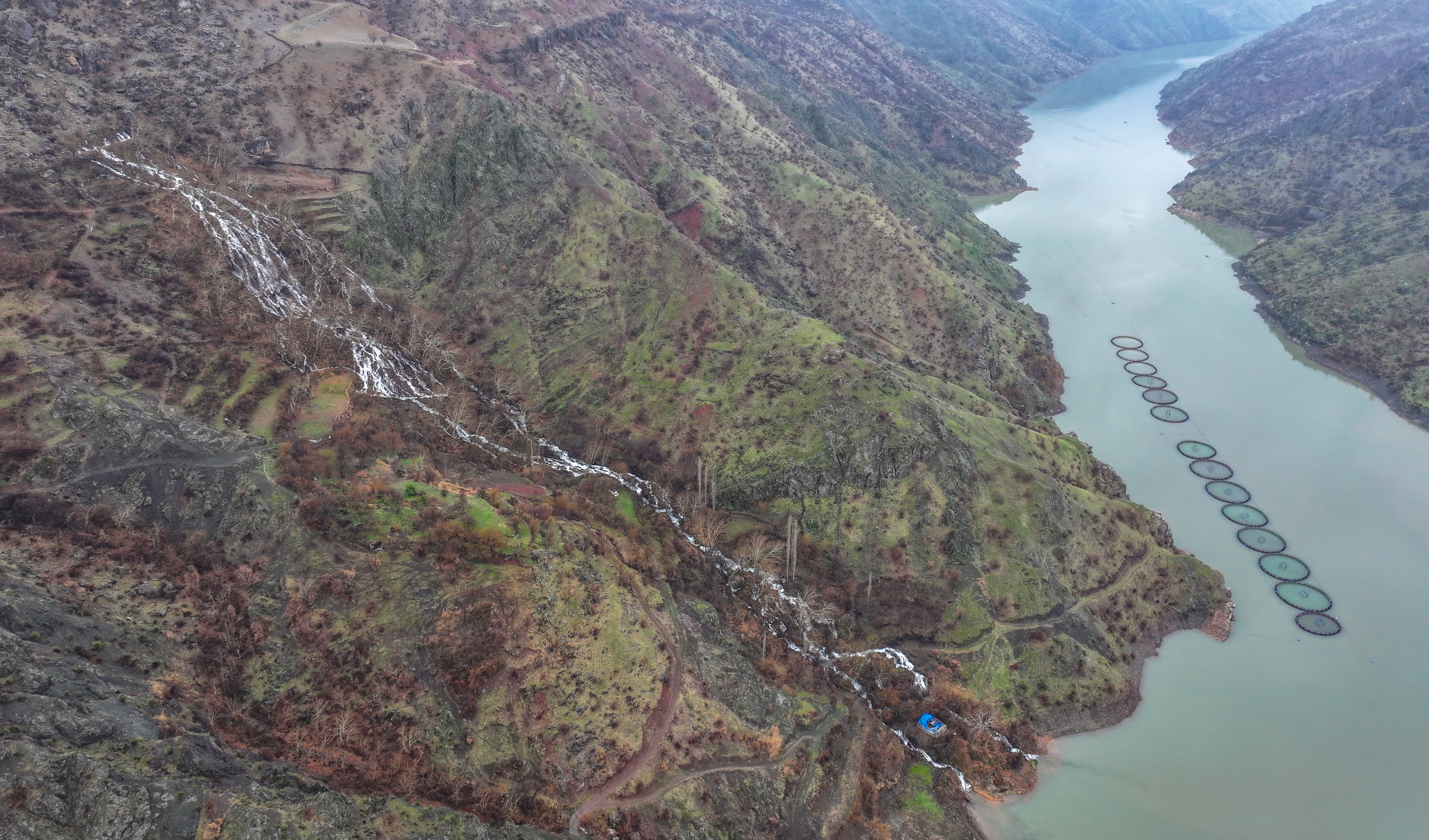 Diyarbakır'ın Çüngüş ilçesinde Maden Dağları’nın sarp yamaçlarından çıkan yeni pınarlar şelaleye dönüşerek Atatürk Baraj Gölü'ne dökülüyor.