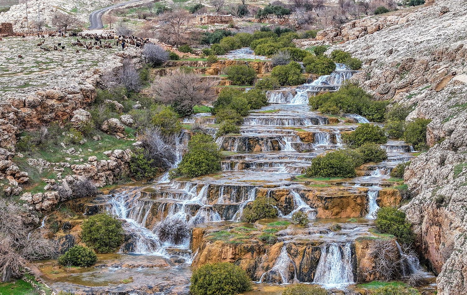 Mardin'in Kızıltepe ilçesinde geçmiş yıllarda yağış azlığı ve kuraklık nedeniyle kuruyan, bu yıl ise yağışlarla yeninden canlanan yörede "Emrud travertenleri" olarak bilinen su kaynağı çağlayanlar ve şelaleler oluşturarak akıyor. / AA