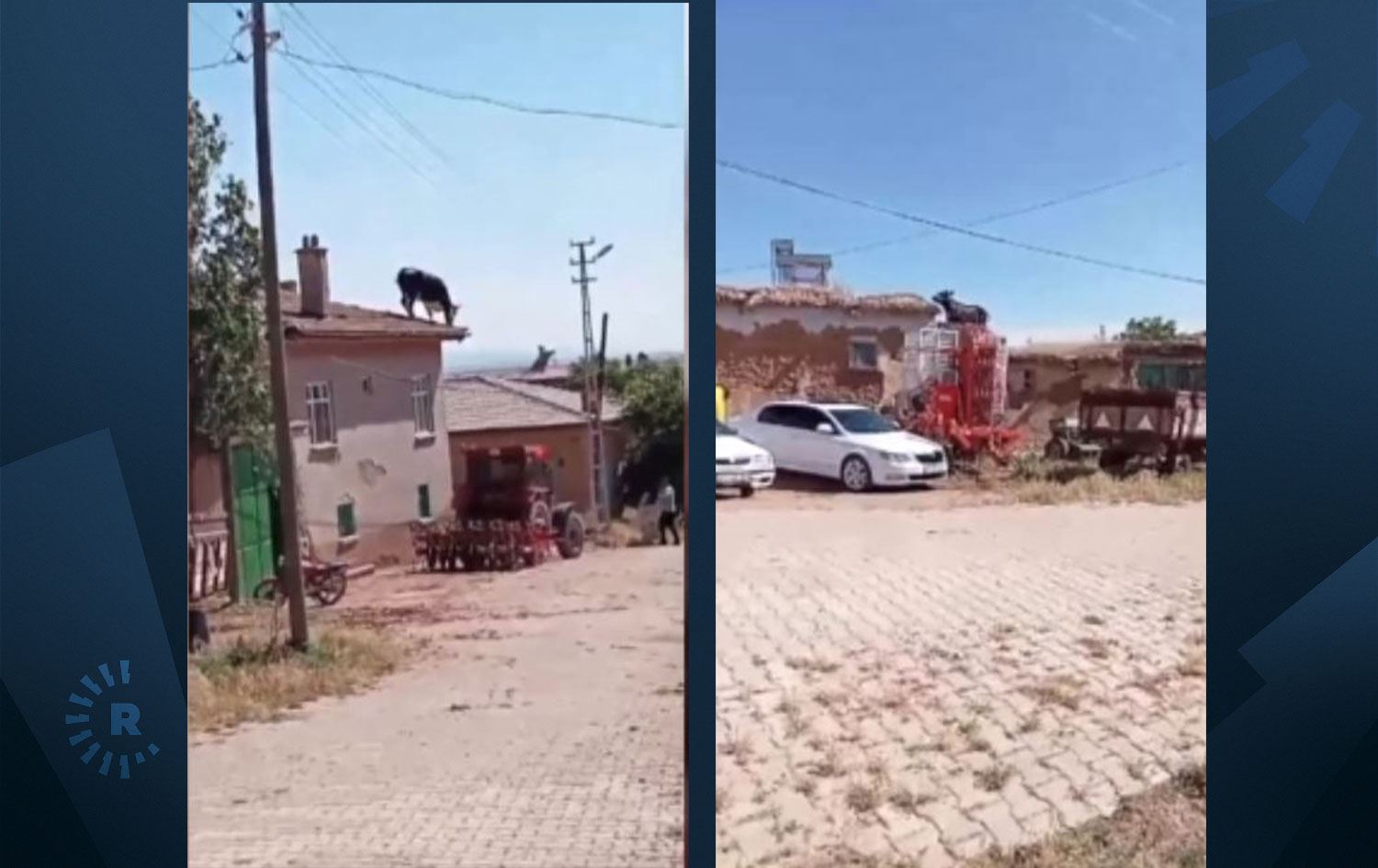 Yakınlarından yardım isteyen Ömer Taykaya'nın büyükbaş hayvanı bu sefer evin çatısına çıktı. Bir süre sahibine direnen hayvan daha sonra kerpiç evin çatısından aşağıya atladı. Yeniden kaçmaya çalışan hayvan güçlükle sakinleştirilerek yakalandı.