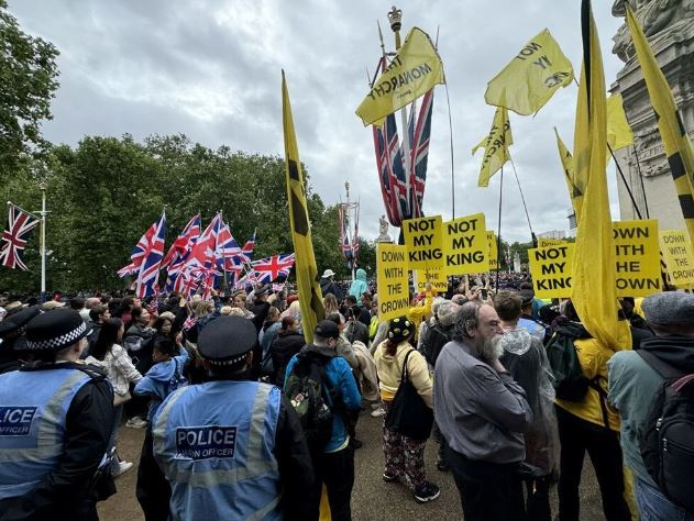Buckingham Sarayı'nın çıkışındaki Victoria anıtının karşısında toplanan Republic grubu üyeleri, kortejin geçişi sırasında "Benim kralım değil", "Tacınla birlikte devril", ve "Monarşiyi kaldır" yazılı pankartlar ve bayraklarla monarşiye tepki gösterdi.