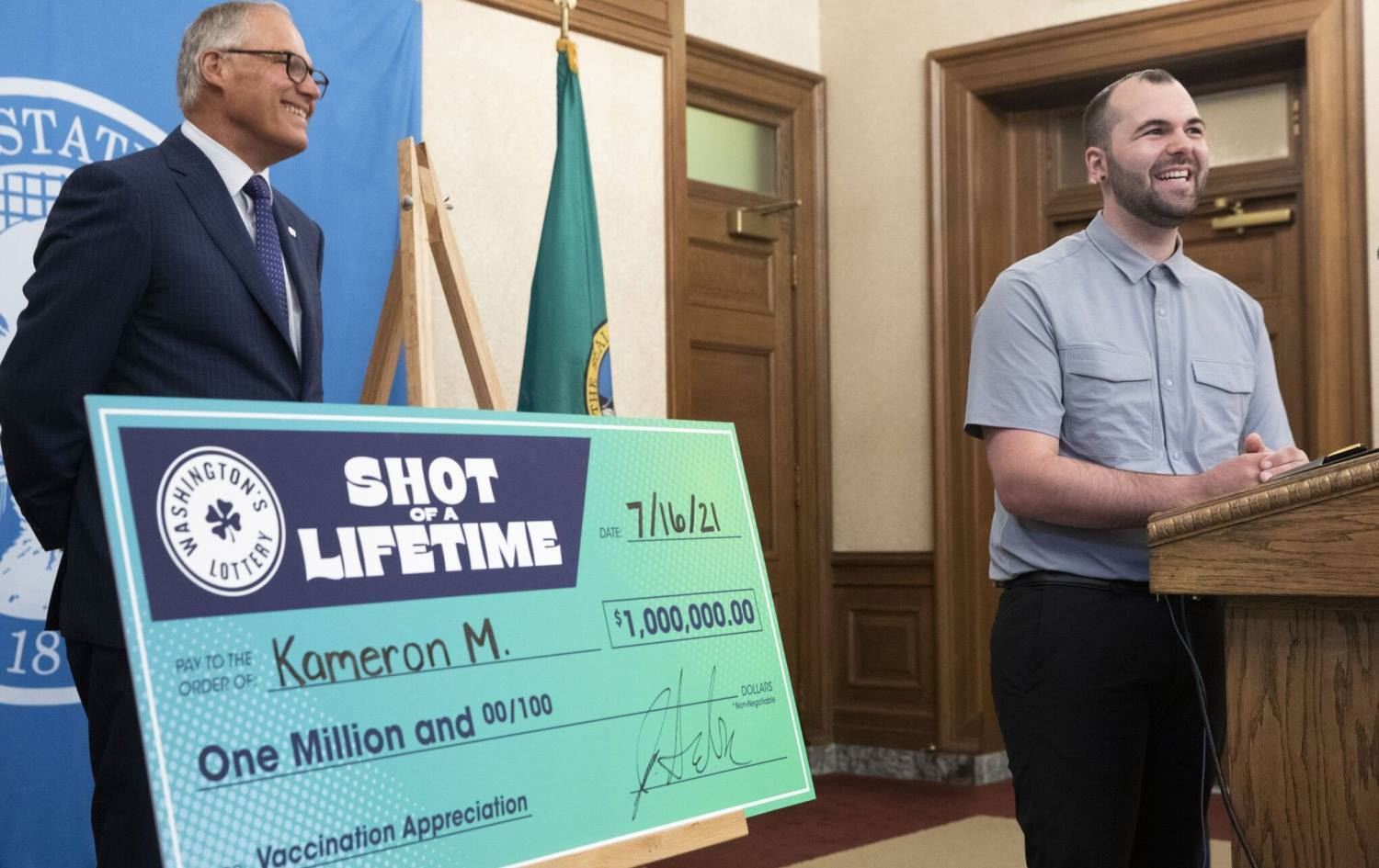 Washington Valisi Jay Inslee, Cuma günü düzenlediği basın toplantısında, eyaletin güneydeki King County ilçesi sakini talihli gence büyük boy bir çek sundu.