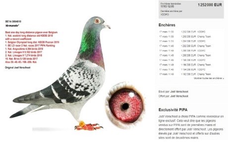 Belçika'da internet üzerinden yapılan müzayedede “Armando” adında erkek bir Flaman güvercini 1 milyon 252 bin euroya alıcı buldu.