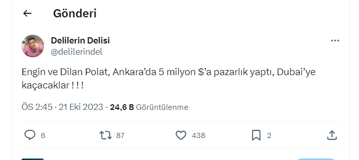 Sosyal medyada dile getirdiği iddialar nedeniyle Türkiye'nin hakkında kırmızı bültenle arama kararı çıkardığı Muhammed Yakut, “Delilerin Delisi” adlı sosyal medya hesabından, “Engin ve Dilan Polat, Ankara’da 5 milyon dolara pazarlık yaptı, Dubai’ye kaçacaklar!!!” şeklinde paylaşım yaptı.