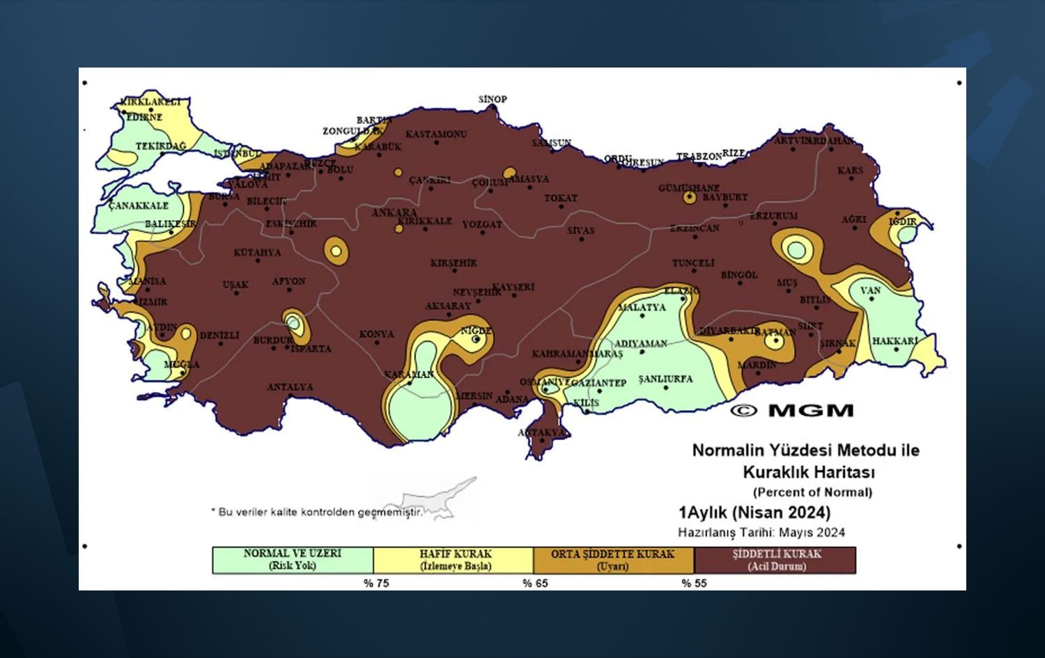 Meteoroloji Genel Müdürlüğü'nün 2024 Nisan ayı meteorolojik kuraklık durumuna ilişkin haritaları, birçok bölgede olağanüstü ve şiddetli kuraklık yaşandığı gösterdi. Normalin Yüzdesi İndeksi (PNI) haritasına göre Trakya, Çanakkale, Muğla, Mersin'in bazı bölgeleri, Güneydoğu Anadolu'nun batısı, Hakkari ve Van çevreleri haricindeki tüm Türkiye'de 'şiddetli kuraklık (acil durum)' ibaresine yer veriliyor. Türkiye'nin neredeyse yüzde 70'lik kısmının şiddetli kuraklık yaşadığını gösteren bu haritaya göre, geri kalan bölgelerin de yine önemli bölümü orta şiddete ve hafif kurak tehlikesi altında görülüyor.