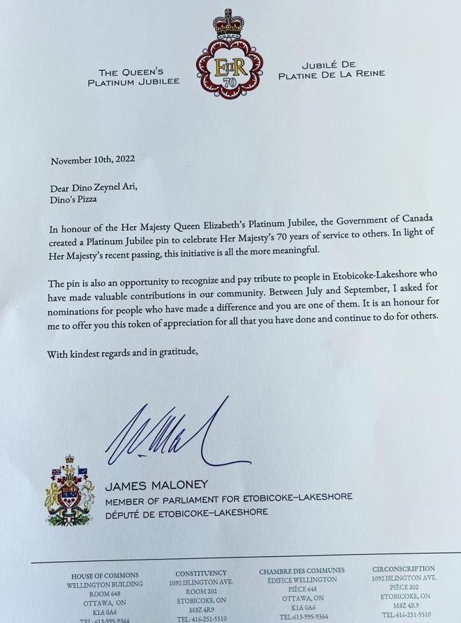 Pandemi döneminde sağlık çalışanlarına, evsizlere ve ihtiyaç sahiplerine ücretsiz olarak pizzalar servis ettiren Zeynel Arı, federal parlamenter James Maloney tarafından Gems of Etobicoke ödülüne aday gösterilmişti.
