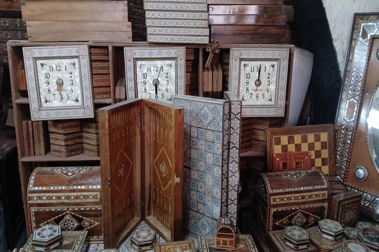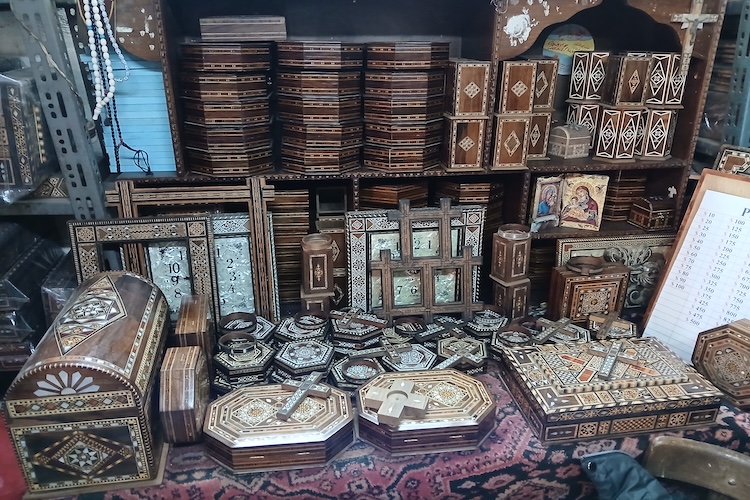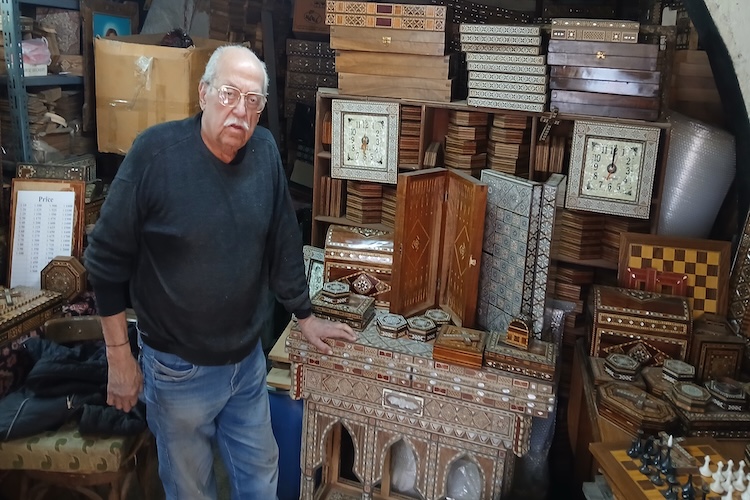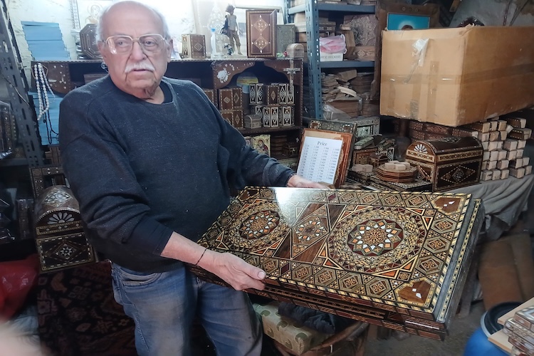 Dükkânının arkasındaki bir bölümün kapısının kilidini açtı ve “Buyurun” diyerek yaptığı eserleri gösterdi. Bu kişinin, ömrünü sedef işçiliğine adayan ve Şam’da “Ebu Tony” (Tony’nin babası) olarak tanınan sanatkâr Afif George Sin olduğunu öğrendik.