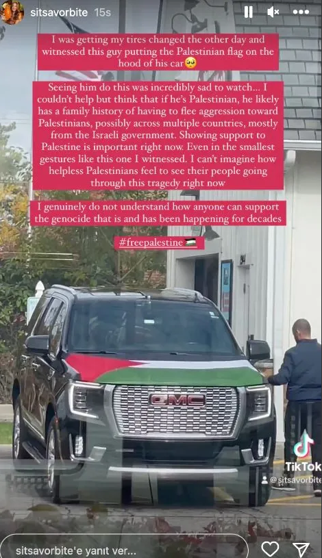 Kullanıcının "Geçtiğimiz gün aracımın lastiklerini değiştiriyordum ve arabasının kaputuna Filistin bayrağı asan bu adamı gördüm" mesajını paylaştığı görüldü.