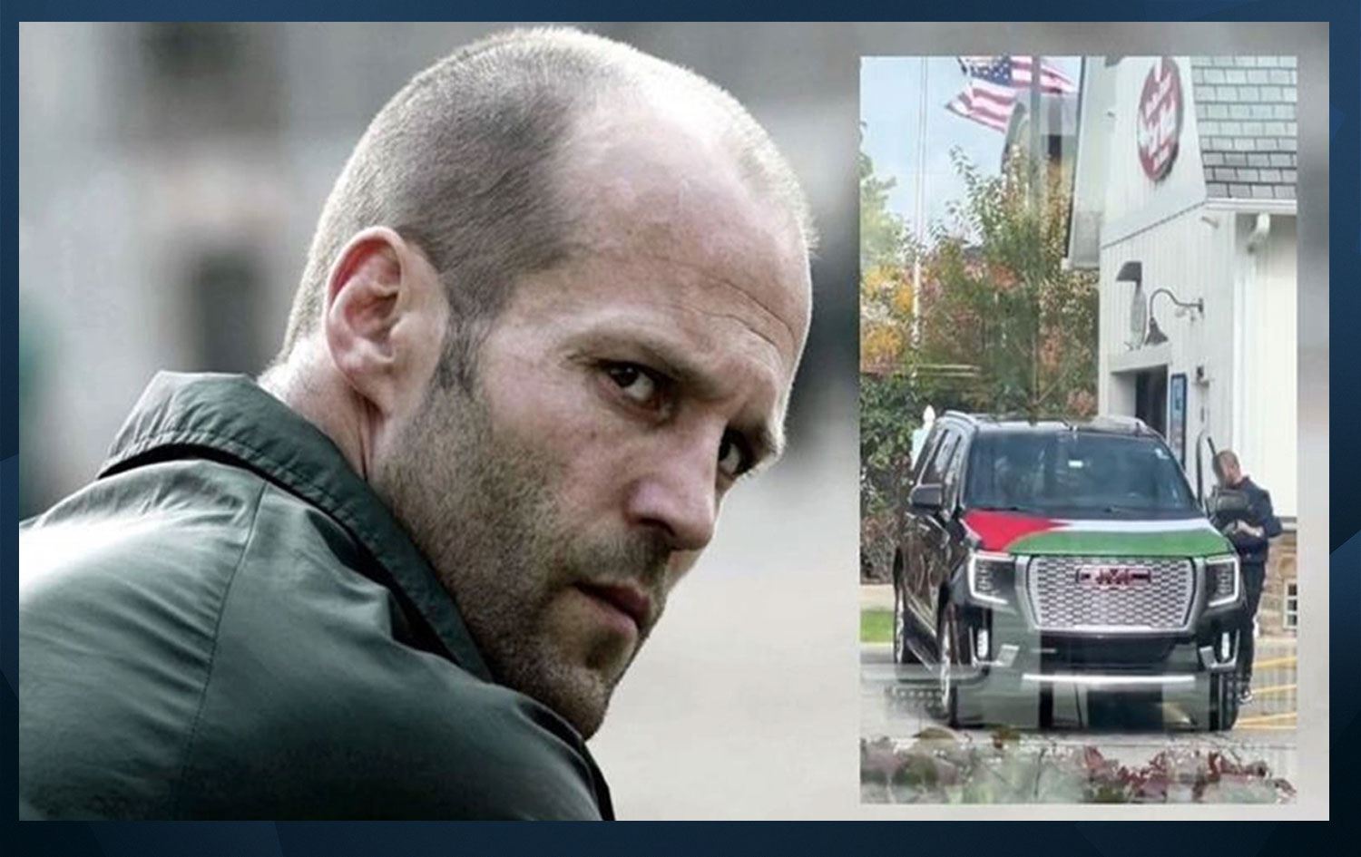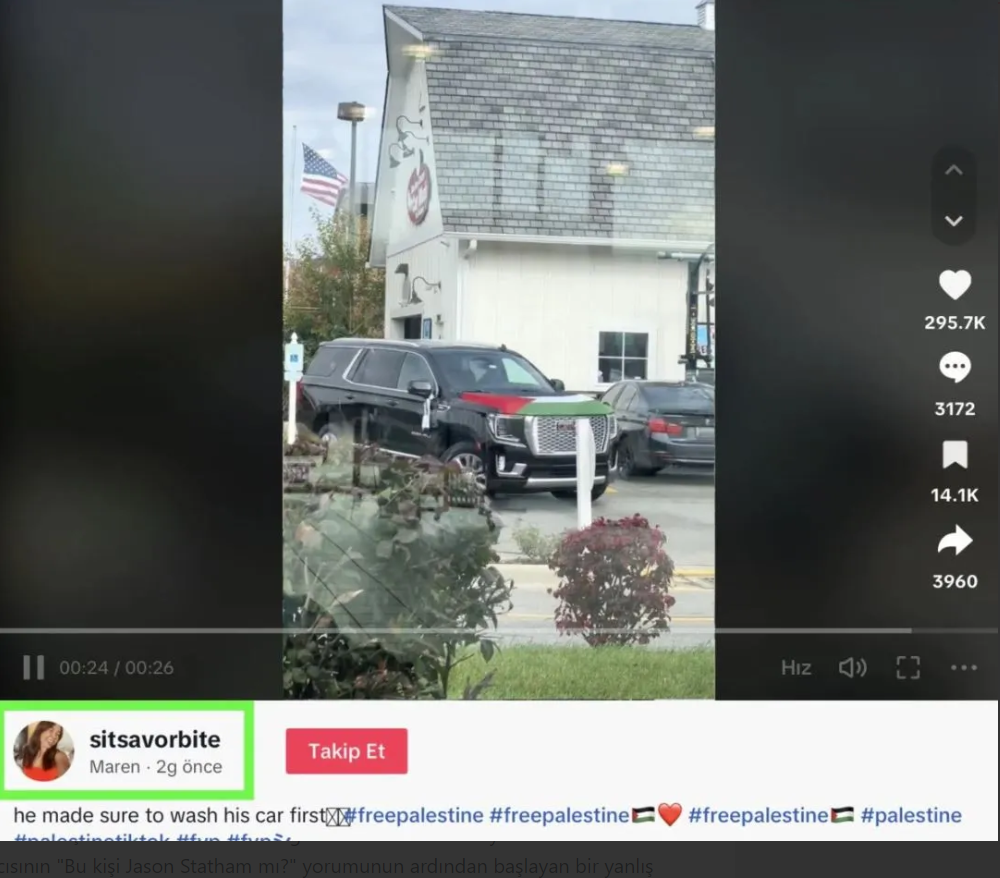 Arabasına Filistin bayrağı astığı görülen kişinin İngiliz oyuncu Jason Statham olduğu iddiası kısa süre içinde sosyal medyada gündem oldu.