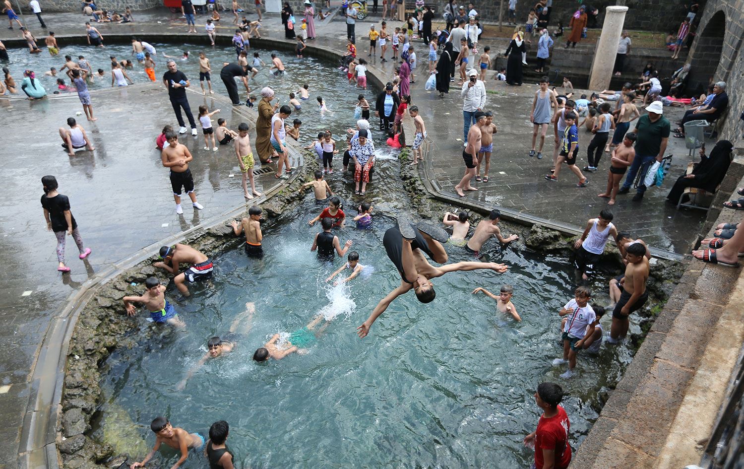 Kentte etkili olan sıcak hava nedeniyle çocuklar, merkez Sur ilçesindeki Anzele Parkı'nda bulunan süs havuzuna girerek serinlemeye çalıştı.
