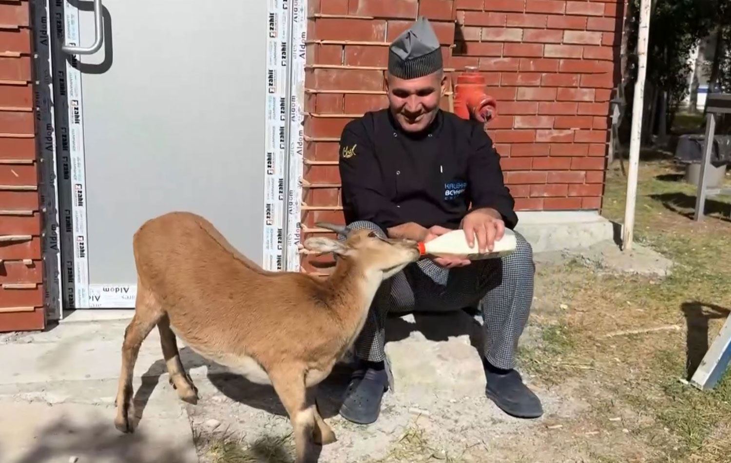 Personel, özenle baktığı keçi yavrusunu biberonla besliyor.