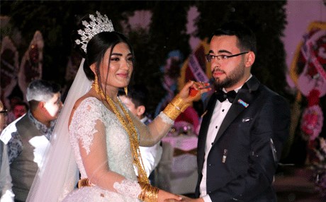 Haber Merkezi - Diyarbakırlı Çiçek ve Urfalı Bucak ailelerinden gençlerin düğününde damat ve geline yaklaşık 5 kilogram altın ve 500 bin lira takıldı.